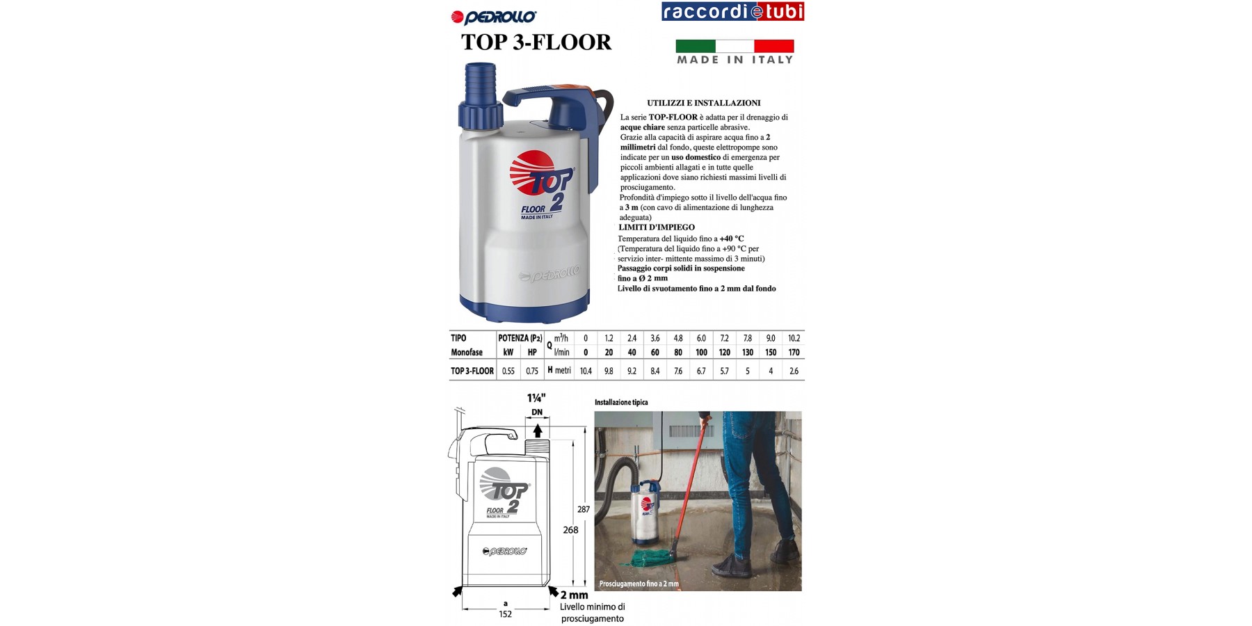 Die TOP-FLOOR Serie eignet sich für die Entwässerung von klarem Wasser ohne abrasive Partikel. Dank der Fähigkeit, Wasser bis zu 2 Millimeter vom Boden abzusaugen, sind sie für den Hausgebrauch im Notfall bei kleinen überfluteten Räumen sowie in allen Anwendungen, bei denen maximale Entwässerungsgrade gefordert sind, geeignet.