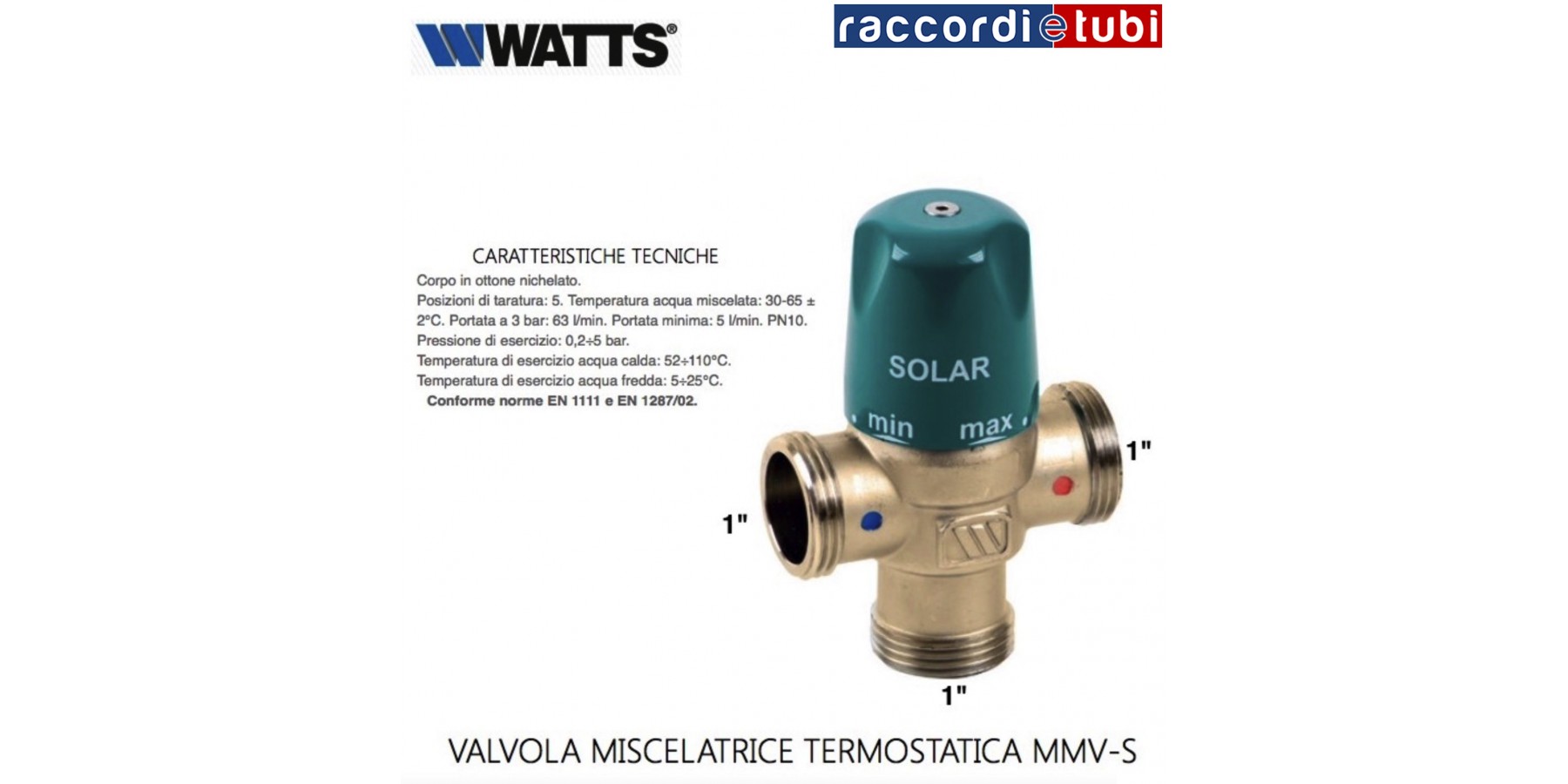 Gehäuse aus vernickeltem Messing. PN10. Dank der 5 Einstellpositionen ermöglicht das Ventil eine genaue Mischung des Wassers aus dem Solarspeicher (±2°C). Betriebsdruck: 0,2÷5 bar. Betriebstemperatur Warmwasser: 52÷110°C. Betriebstemperatur Kaltwasser: 5÷25°C. Einstellbereich: 30÷65°C. Durchfluss bei 3 bar: 63 l/min. Mindestdurchfluss: 5 l/min.