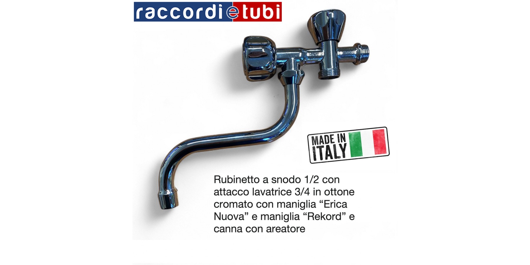 Schwenkbarer Wasserhahn mit Waschmaschinenanschluss aus verchromtem Messing mit Griff „Erica Nuova“ und Griff „Rekord“ sowie Auslaufhahn mit Perlator