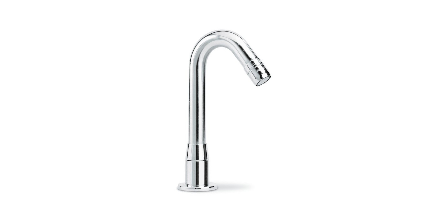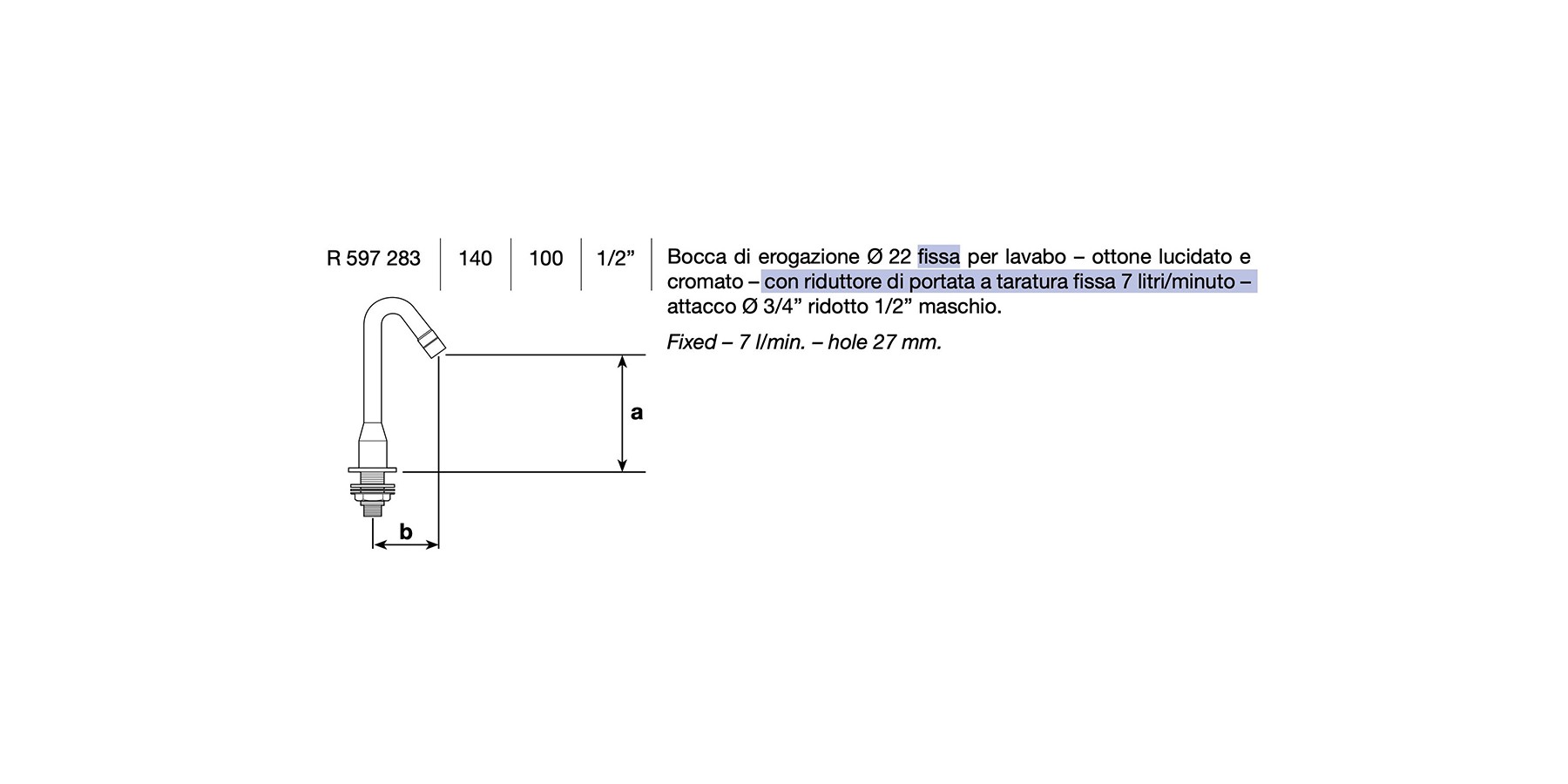 Fester Auslauf für Waschbecken Ø 22 – polierte und verchromte Oberfläche – mit fest eingestelltem Durchflussbegrenzer auf 7 Liter/Minute – Anschluss Ø 3/4” auf 1/2” männlich reduziert – fest – 7 l/min. – Loch 27 mm.