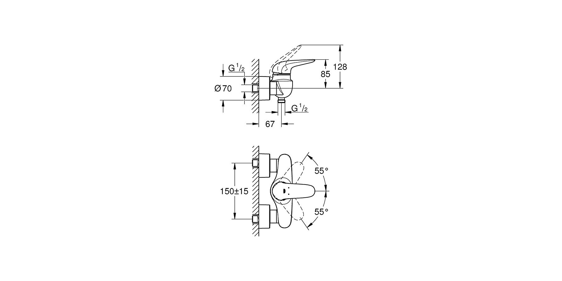 EurostyleEinhebelmischer außen 1/2" für DuscheAnschluss für Schlauch 1/2"mit integriertem RückschlagventilTemperaturbegrenzer als Zubehör erhältlich (aktivierbar)mit einstellbarem Durchflussbegrenzermit einstellbarem Durchflussbegrenzer