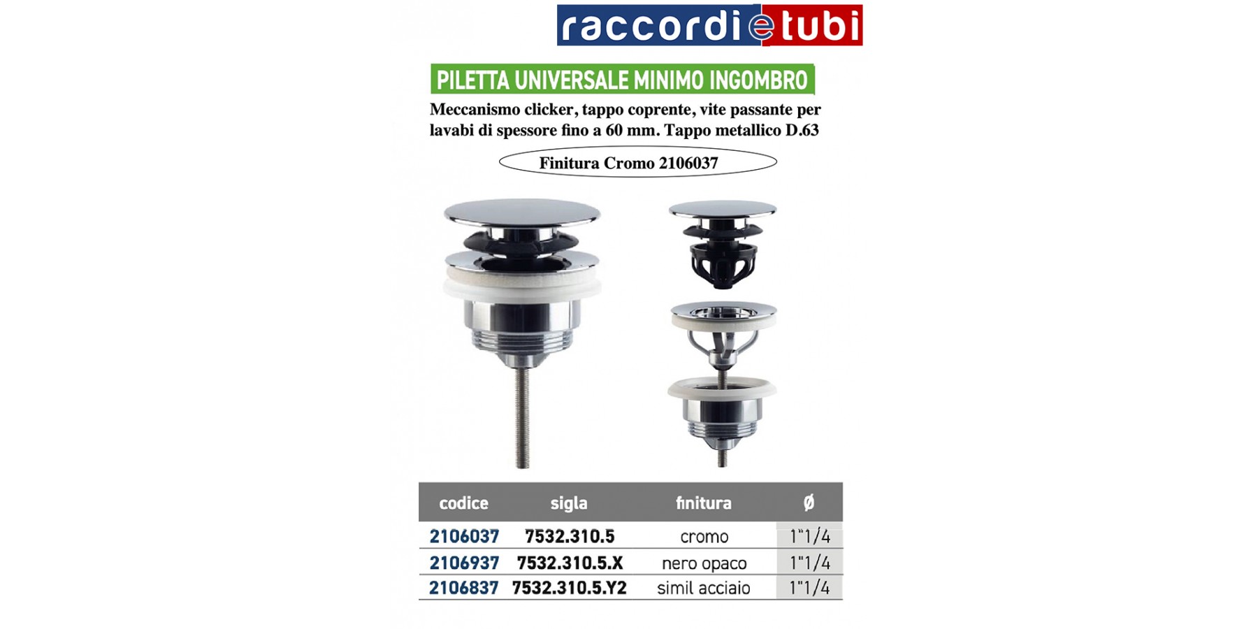 Clicker-Mechanismus, abdeckender Stopfen, durchgehende Schraube für Waschbecken mit einer Stärke von bis zu 60 mm. Metallischer Stopfen D.63