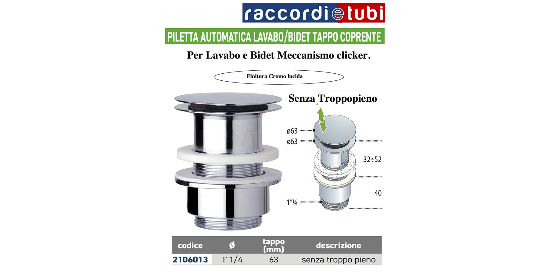 AUTOMATISCHER Ablauf Stöpsel Waschbecken-Bidet 1 1/4''x63mm ohne Überlauf, Cliker System
