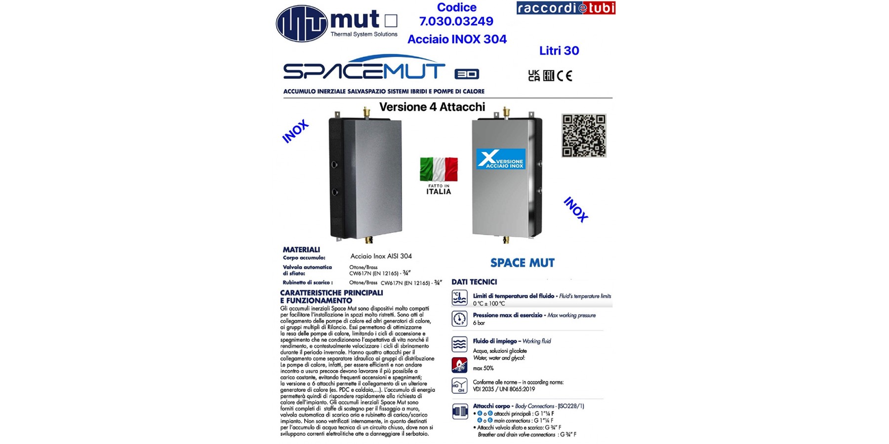 Space Mut Trägheitsspeicher aus Stahl EDELSTAHL 304, isoliert für Hybridanlagen und Wärmepumpen, mit 4 oder 6 Hauptanschlüssen 1”¼ Innengewinde. • Kugelhahn zur Entleerung G¾” Messing CW617N (EN 12165) • Automatische Luftablassventil G¾” Messing CW617N (EN 12165) • Trägheitsspeicherbehälter: blankgeätzter lackierter Stahl • Einsatzflüssigkeiten: Wasser und Glykol-Lösungen nach UNI8065:2019 / VDI2035 (max. Glykolanteil = 50%). • Maximaler Betriebsdruck: 6 bar. • Betriebstemperaturbereich 0÷100°C. • Isolierung: vorgeformte Heißschale aus geschäumtem PE-X mit geschlossenen Zellen, 15 mm dick. Betriebstemperaturbereich -40÷130 °C.