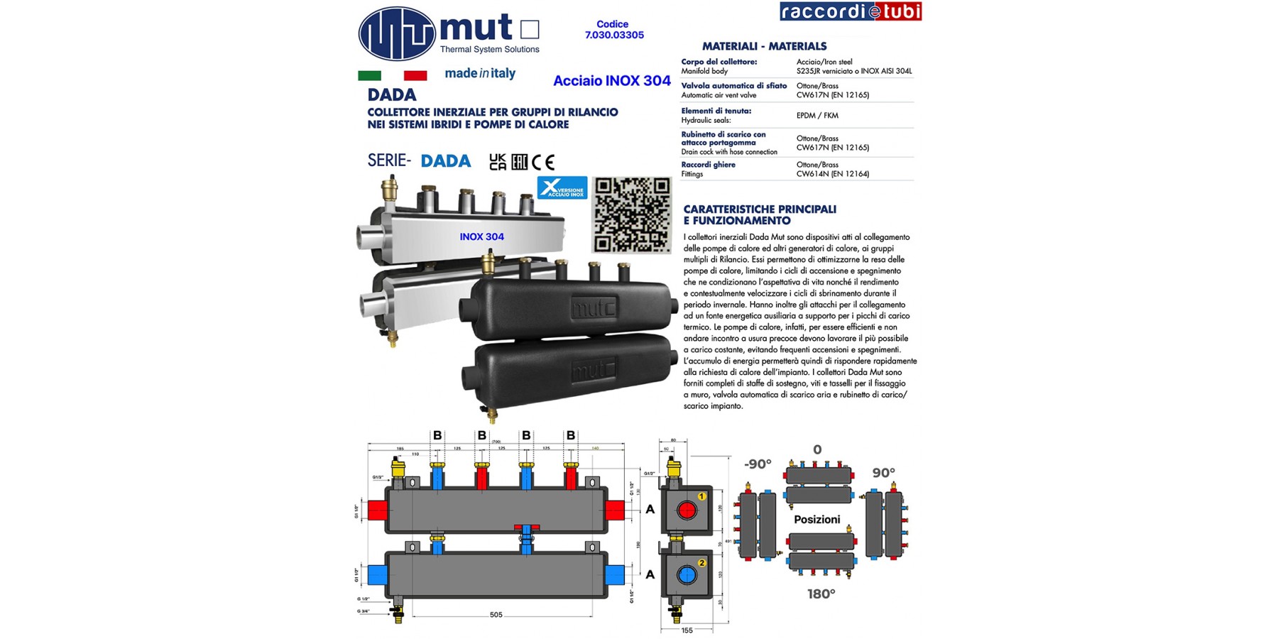Die Energievorratsspeicherung ermöglicht es somit, schnell auf die Wärmebedarfsanforderungen der Anlage zu reagieren. Die Dada Mut Sammler werden komplett mit Halterungen, Schrauben und Dübeln zur Wandbefestigung, automatischem Luftablassventil und Befüll-/Entleerungshahn geliefert.
