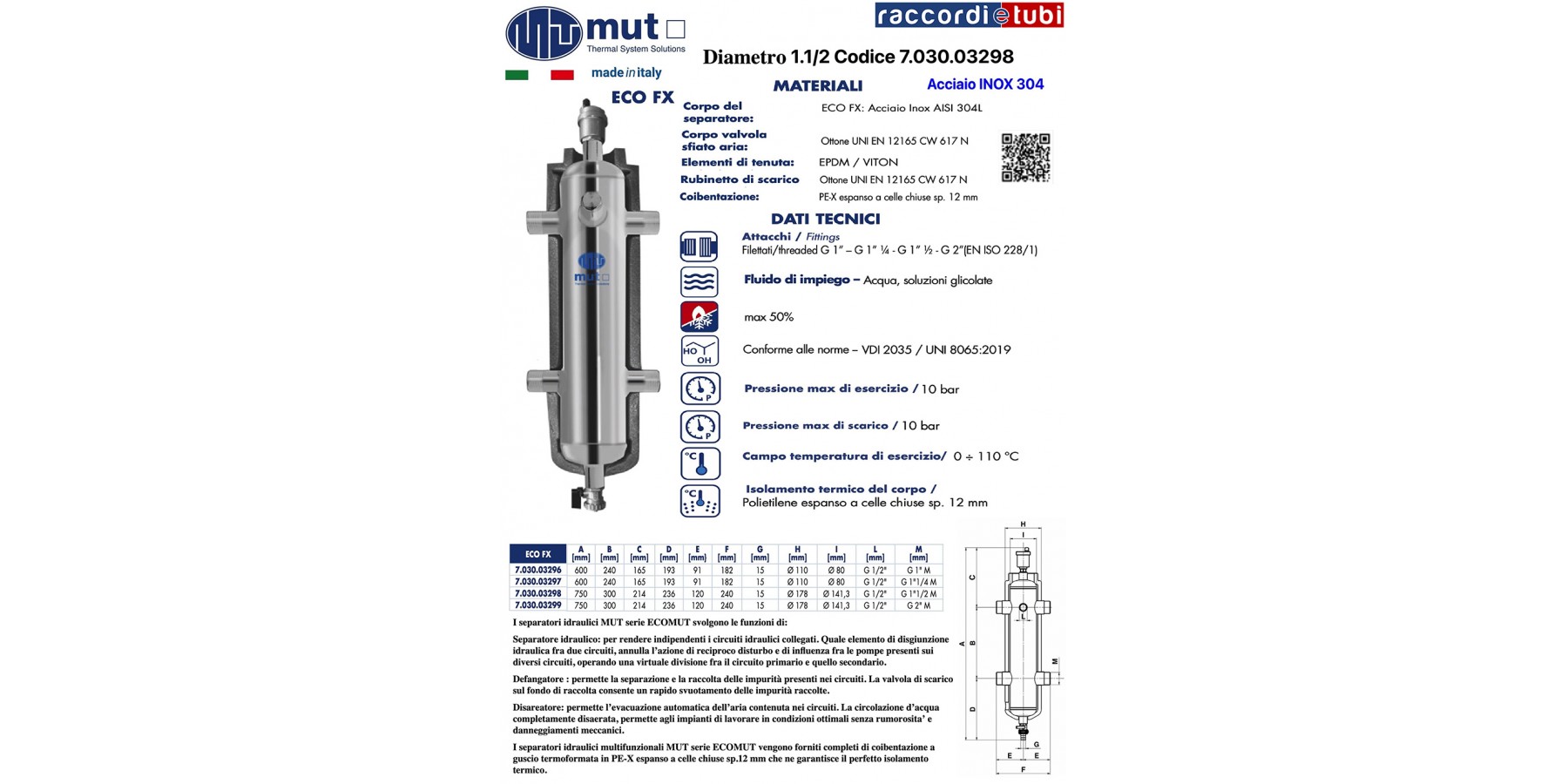 Hydraulischer Trenner/Entlüfter/Schlammsammler MUT Serie ECO. Version INOX 304 FX” mit männlichen Gewindeverbindungen: • 1” M (FX 7.030.03296) • 1”¼ M (cod.FX 7.030.03297) • 1”½ M FX 7.030.03298) • 2” M FX 7.030.03297 aus AISI 304L Stahl. Einsatzflüssigkeiten Wasser, Glykol-Lösungen. Maximale Glykolanteil 50%. Maximaler Betriebsdruck 10 bar. Betriebstemperaturbereich 0÷110 °C. AUSGESTATTET MIT: • Automatisches Entlüftungsventil mit Messinggehäuse UNI EN 12165 CW 617 N • Hydraulische Dichtungen aus EPDM/VITON • Kugelabsperrventil mit Messinggehäuse UNI EN 12165 CW 617 N • Frontseitiger Sondeanschluss 1/2” F • Wärmedämmschale aus geschlossenzelligem Polyethylen, Stärke 12 mm