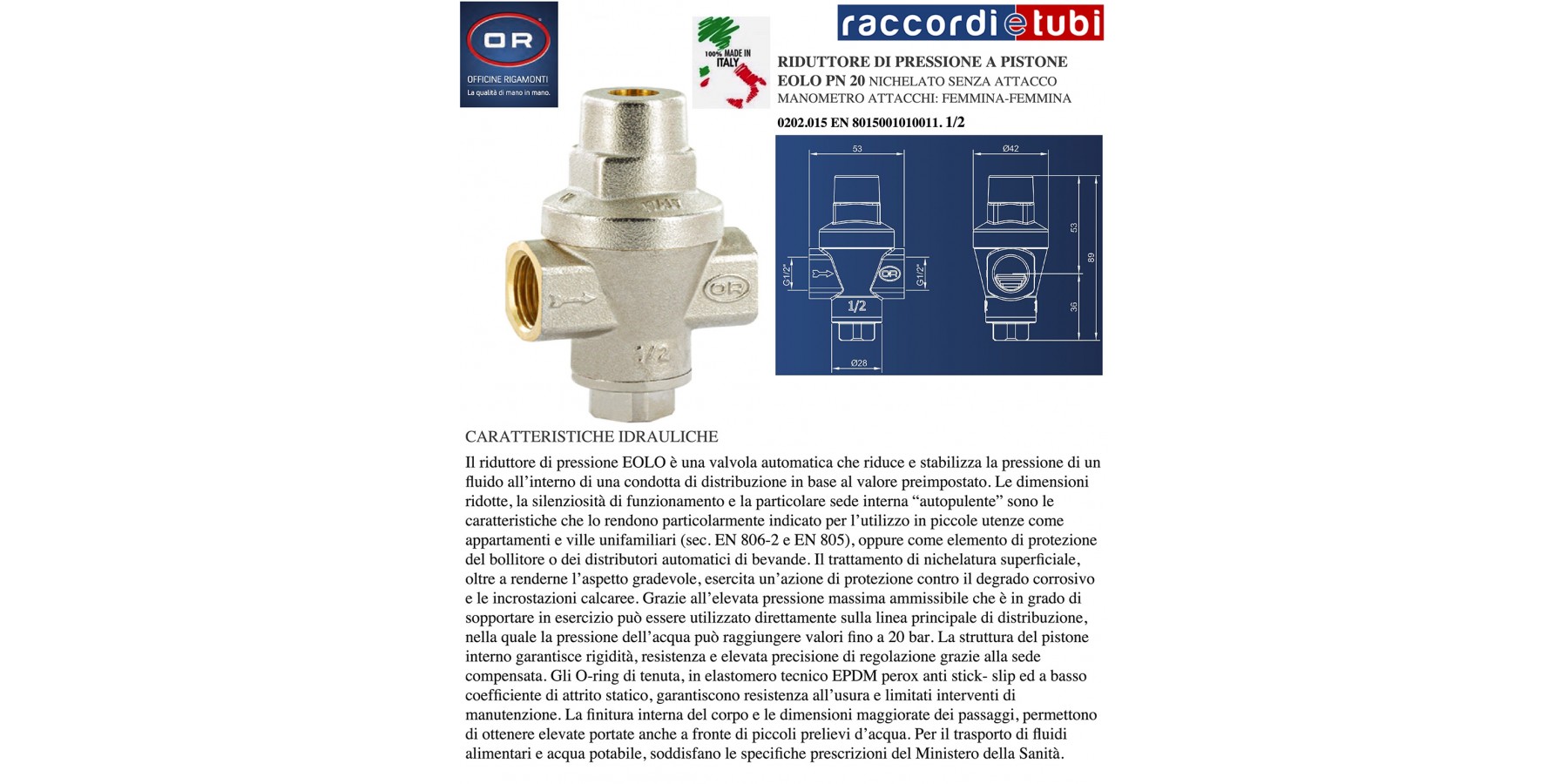 Der EOLO-Druckminderer ist ein automatisches Ventil, das den Druck einer Flüssigkeit innerhalb einer Verteilungsleitung entsprechend dem voreingestellten Wert reduziert und stabilisiert. Die kompakten Abmessungen, der geräuscharme Betrieb und der spezielle, „selbstreinigende“ Innenbereich machen ihn besonders geeignet für den Einsatz in kleinen Verbrauchseinheiten wie Wohnungen und Einfamilienhäusern (lt. EN 806-2 und EN 805) oder als Schutzvorrichtung für den Boiler oder Getränkeautomaten. Die oberflächenvernickelte Behandlung verleiht nicht nur ein ansprechendes Aussehen, sondern schützt auch vor korrosivem Abbau und Kalkablagerungen. Dank des hohen maximal zulässigen Betriebsdrucks kann er direkt an der Hauptverteilungsleitung eingesetzt werden, in der der Wasserdruck bis zu 20 bar erreichen kann. Die Konstruktion des inneren Kolbens gewährleistet Steifigkeit, Widerstandsfähigkeit und eine hohe Einstellgenauigkeit durch den ausgeglichenen Sitz. Die Dichtungs-O-Ringe aus technischem EPDM-Peroxid-Kautschuk mit Anti-Stick-Slip-Eigenschaft und niedrigem statischem Reibungskoeffizienten gewährleisten Verschleißfestigkeit und reduzieren Wartungsarbeiten. Die Innenoberflächenveredelung des Gehäuses und die größeren Durchgangsdimensionen ermöglichen hohe Durchflussraten auch bei geringem Wasserverbrauch. Für den Transport von Lebensmitteln und Trinkwasser erfüllen sie die spezifischen Vorschriften des Gesundheitsministeriums.
