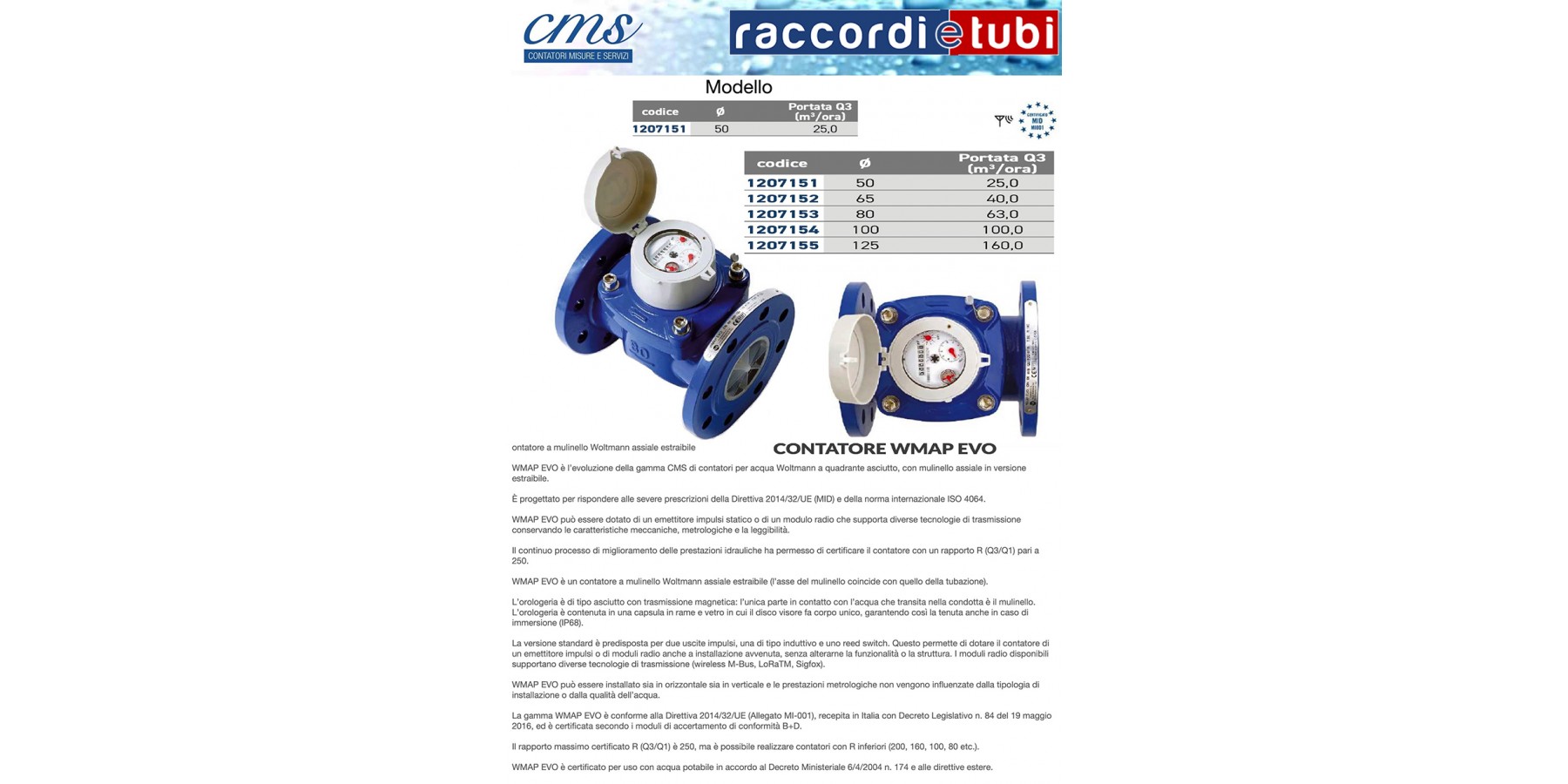 Horizontale, vertikale oder geneigte Installation. Herausnehmbar. Bewegungsübertragung durch Magnetkupplung. Nenndruck 10/16 bar. Maximale Betriebstemperatur 50°C. Ausgestattet mit 2 Impulsausgängen (einer induktiv, einer Reed-Schalter), zur Installation des Impulssenders ohne Veränderung der Dichtigkeit. Impulsausgang: 1 Impuls=100 Liter (ab DN 50: 125), 1 Impuls=1.000 Liter (ab DN 150: 200). Europäische Norm EN 14154, Richtlinie 2004/22/EG (MID), Gebrauchszertifizierung für Trinkwasser DM 6/4/2004 Nr.174.