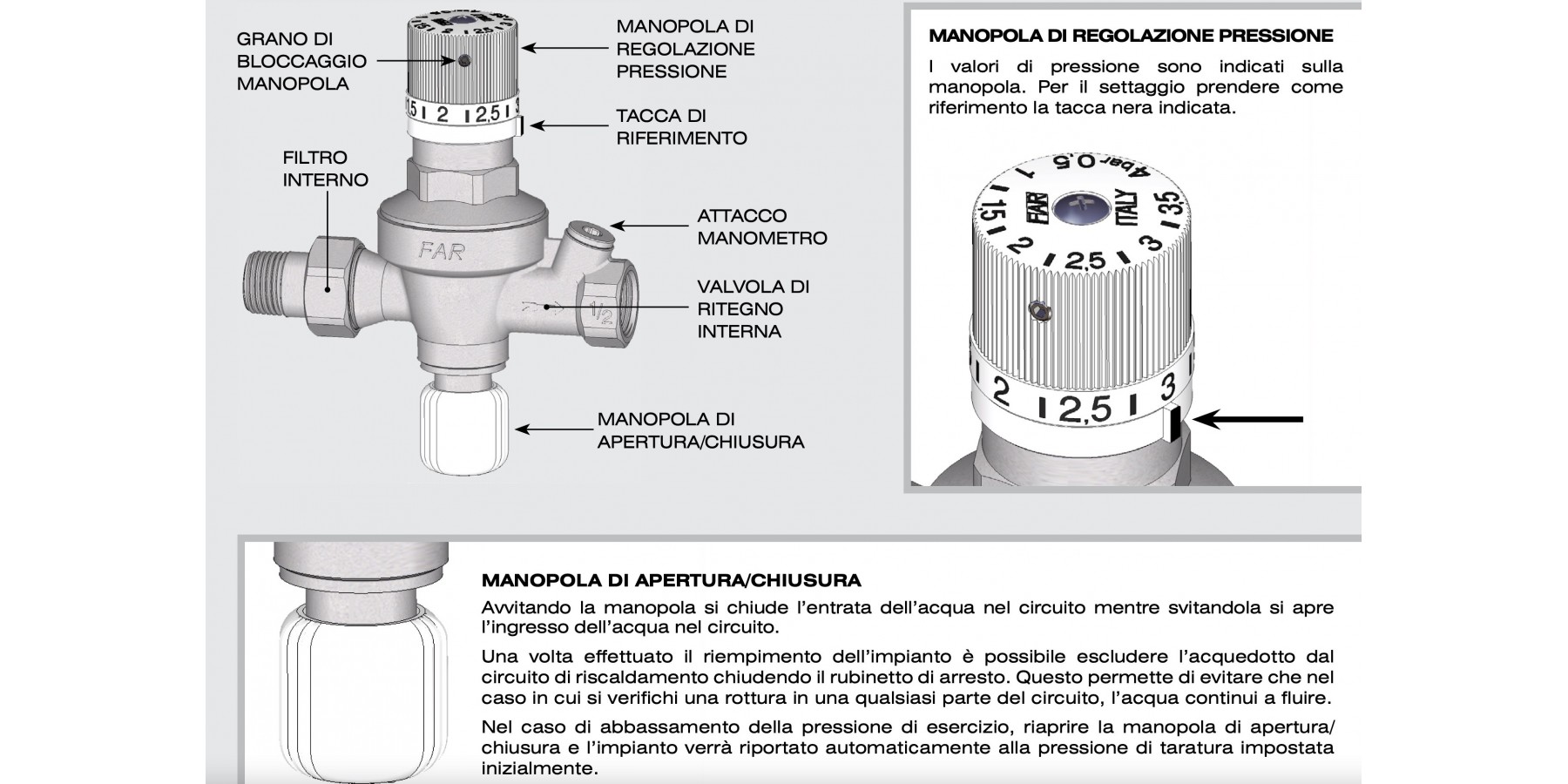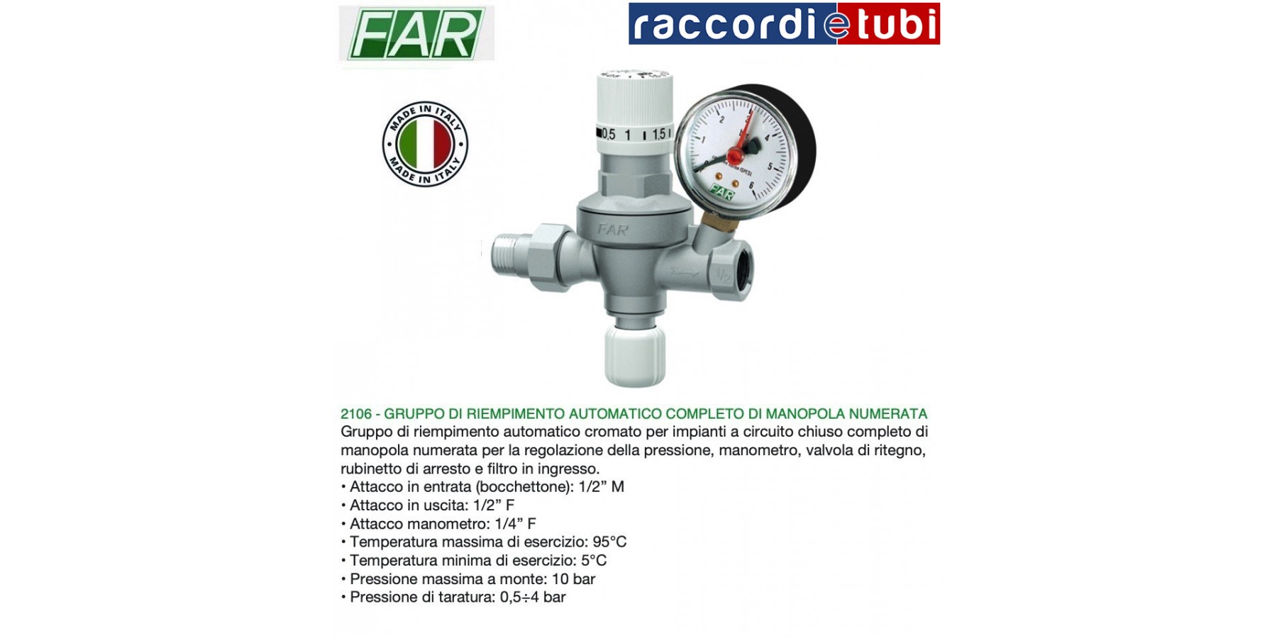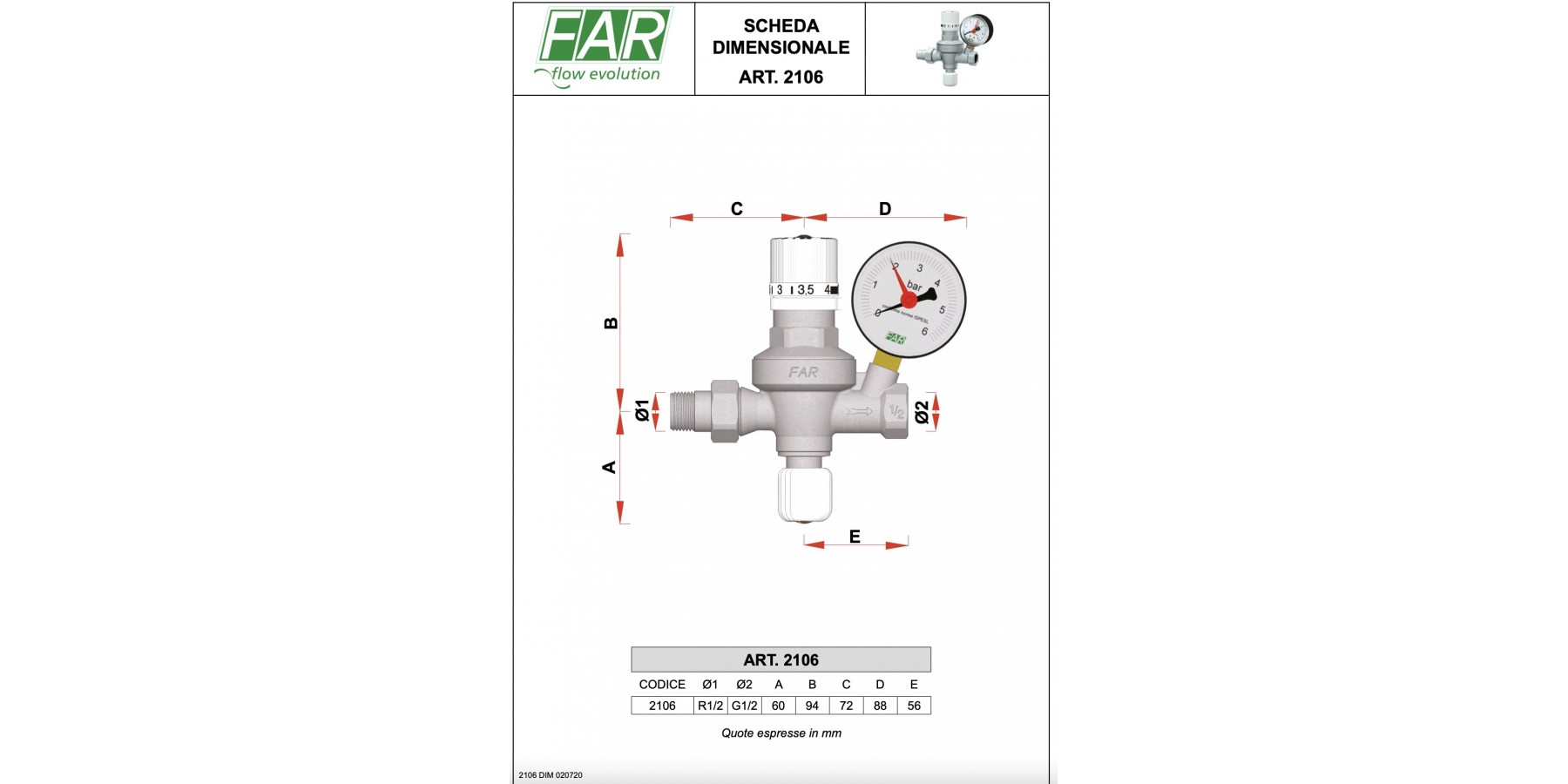 Maximale Betriebstemperatur: 95°C Minimale Betriebstemperatur: 5°C Maximaler Vordruck: 10 bar Einstelldruck: 0,5 ÷ 4 bar Rückschlagventil: Differenzdruck 0,02 bar Filter: 450 μm Gehäuse und interne Teile: Messing CW617N und CB753S Feder: Stahl AISI302 Membran des Reduzierers: NBR OR-Dichtung: EP