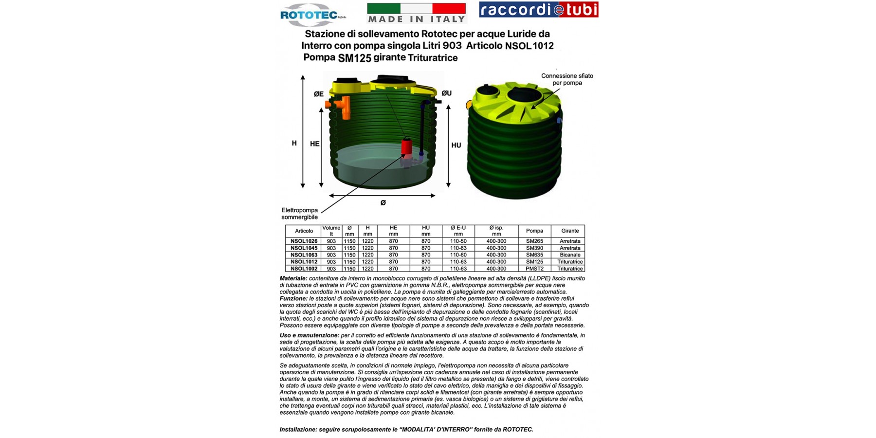 Material: unterirdischer, monoblock-geschweißter Behälter aus gegliedertem linearen Polyethylen hoher Dichte (LLDPE) mit glatter Oberfläche, ausgestattet mit einem PVC-Einlassrohr mit NBR-Gummidichtung, Tauchmotorpumpe für Schmutzwasser, angeschlossen an eine Ausgangsleitung aus Polyethylen. Die Pumpe verfügt über einen Schwimmer für automatische Start-/Stopp-Funktion.