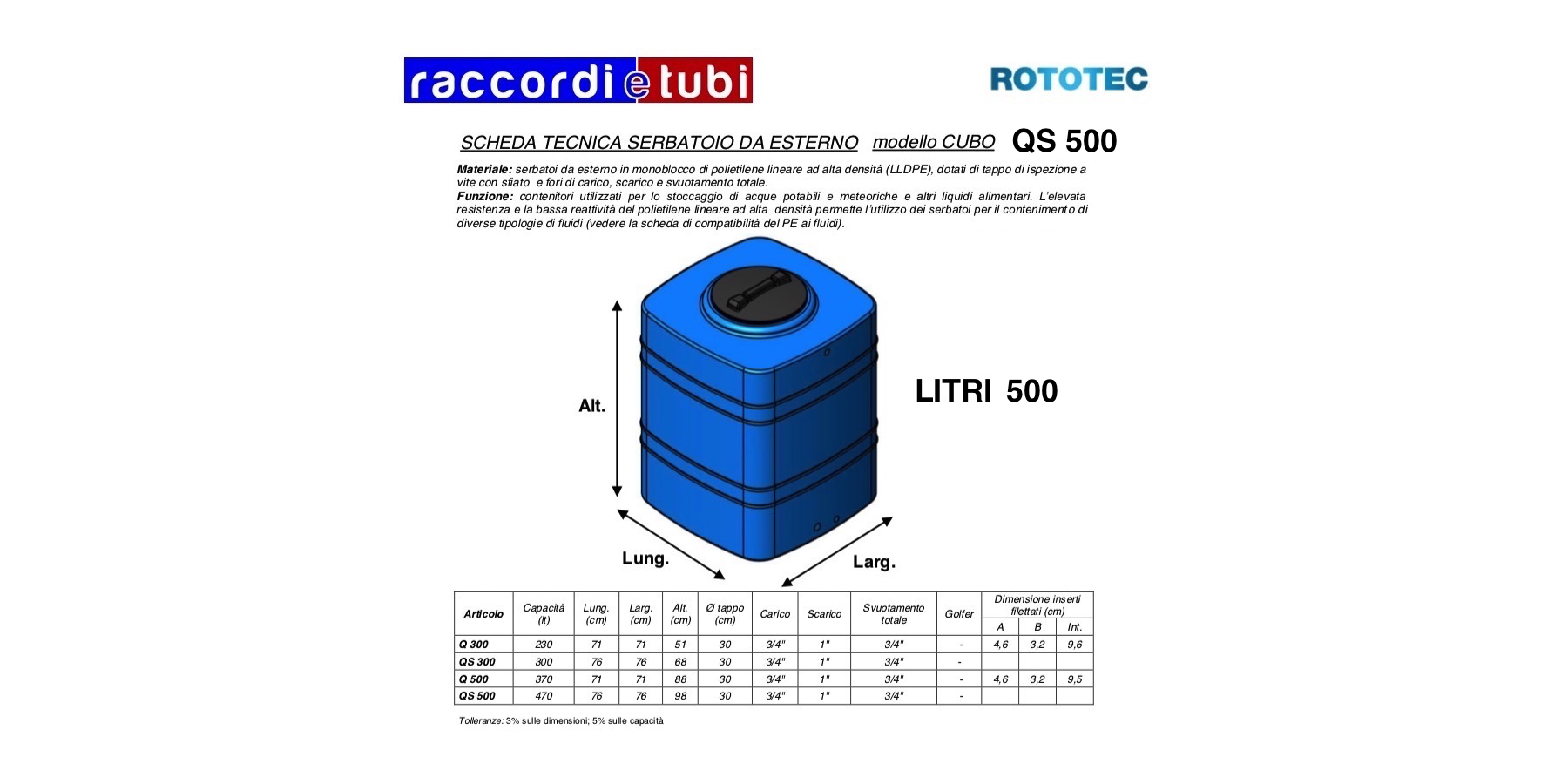 Material: Außenbehälter aus monolithischem linearem hochdichtem Polyethylen (LLDPE), ausgestattet mit Schraubinspektionsdeckel mit Entlüftung sowie Einfüll-, Ablass- und Totalausleerungsöffnungen. Funktion: Behälter zur Lagerung von Trinkwasser, Regenwasser und anderen Lebensmittelflüssigkeiten. Die hohe Widerstandsfähigkeit und die geringe Reaktivität des linearen hochdichten Polyethylens erlauben die Verwendung der Tanks für die Lagerung verschiedener Flüssigkeitstypen (siehe PE-Kompatibilitätsliste für Flüssigkeiten). Gebrauch und Wartung: Die Tanks halten Außentemperaturschwankungen von – 20 °C bis 80 °C stand, unterliegen keiner zeitlichen Verschlechterung und die verwendeten Materialien gewährleisten höchste Zuverlässigkeit bezüglich Korrosions- und Oxidationsproblemen. Die monolithische Bauweise garantiert Robustheit und Stabilität, da keine Schweißnähte vorhanden sind, die durch innere Spannungen geschwächt werden könnten. Für Montagezwecke können an den vorgesehenen Flächen Löcher in die Tanks gebohrt werden. Die glatten Oberflächen der Tanks ermöglichen eine leichte Wartung, die Leichtigkeit einen einfachen Transport und die Installation. Außerdem sind die Kosten deutlich niedriger als bei Metall, Beton und GFK. Farbverfügbarkeit: Standard: Blau; auf Anfrage: Grün, Terrakotta, Grau.