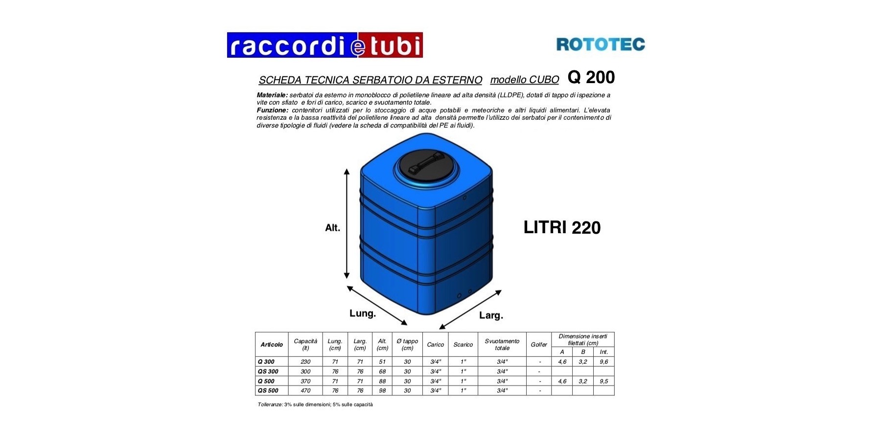 Material: Außenbehälter aus nahtlosem linearem hochdichtem Polyethylen (LLDPE), ausgestattet mit Schraubdeckel mit Entlüftung sowie Füll-, Entleerungs- und Ablauföffnungen. Funktion: Behälter zur Lagerung von Trink- und Regenwasser sowie anderen Lebensmittelflüssigkeiten. Die hohe Beständigkeit und geringe Reaktivität des linearen hochdichten Polyethylens ermöglicht die Verwendung der Tanks für verschiedene Flüssigkeitstypen (siehe Kompatibilitätsdatenblatt PE-Flüssigkeiten). Gebrauch und Wartung: Die Behälter halten Temperaturschwankungen von –20 °C bis 80 °C stand, weisen keine Alterungserscheinungen auf und die verwendeten Materialien gewährleisten maximale Zuverlässigkeit hinsichtlich Korrosions- und Oxidationsprobleme. Die einteilige Bauweise garantiert Robustheit und Stabilität, da keine Schweißnähte vorhanden sind, die durch innere Spannungen geschwächt werden könnten. Bei Installationsbedarf können an den vorgesehenen Ebenen Öffnungen in die Behälter gebohrt werden. Die glatten Oberflächen der Tanks erleichtern die Wartung, das geringe Gewicht ermöglicht einfachen Transport und Installation. Zudem sind die Kosten deutlich niedriger als bei Metall, Beton oder GFK. Verfügbare Farben: Standard: Blau; auf Anfrage: Grün, Terrakotta, Grau.