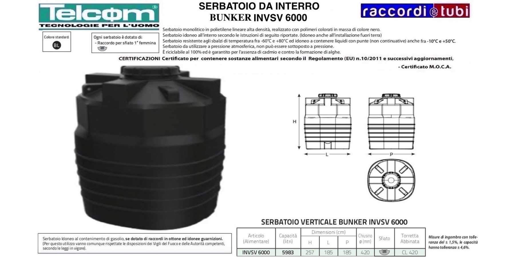 TRANSPORT Beim Transport dürfen die Tanks niemals geschleift werden, um Kratzer oder Beschädigungen zu vermeiden, die die Monolitheit und Integrität an dieser Stelle beeinträchtigen könnten. Bewegen Sie den Tank niemals, wenn er voll ist. Während des Transports darf der Tank niemals gegen Kanten oder harte Gegenstände gestoßen werden, da er zwar sehr stoßfest ist, dennoch Verletzungen erleiden kann, die nicht sofort sichtbar sind. INSTALLATION Beim Anschluss der „starren“ Netzrohre an unsere Armaturen (oder von Ihnen oder uns montierte bzw. nach Ihren Vorgaben geschweißte Zusatzarmaturen) ist darauf zu achten, flexible Schläuche zu verwenden, die mindestens das Zweifache des Rohrdurchmessers lang sind, oder vorzugsweise eine Dehnungsfuge einzubauen, um zu verhindern, dass die Armaturen durch die ständige Belastung vom Ein- und Auslaufen der Flüssigkeit im Tank Beanspruchungen, Biegungen und Spannungen ausgesetzt werden. Wir weisen darauf hin, dass eine Dehnungsfuge oder ein flexibler Schlauch immer zwischen zwei entsprechend bemessenen Fixpunkten angebracht werden muss, die der axialen Kraft der Dehnungsfuge standhalten, wobei diese koaxial zu diesen Punkte angeordnet sein sollen. Andernfalls können unmerkliche und leichte Biegungen der Wände Schäden an den Armaturen oder am Tank selbst verursachen, wenn diese Vorsichtsmaßnahmen nicht beachtet werden. Zudem sollten Stützhalterungen vorgesehen werden, um zu verhindern, dass Gewicht und externe Vibrationen auf die Tankanschlüsse wirken. Um eine perfekte Dichtung zwischen dem Gewinde der Armatur und dem Schlauch zu erreichen, legen Sie eine angemessene Menge PTFE-Band (Teflonband) auf, ohne beim Anziehen übermäßig zu kraftaufwenden. Abschließend wird der Deckel auf den Tank geschraubt, jedoch nicht zu fest angezogen, und es ist sicherzustellen, dass das Entlüftungsventil (oder das Entlüftungssystem) funktioniert, welches dazu dient, den Druck im Inneren des Tanks konstant zu halten.