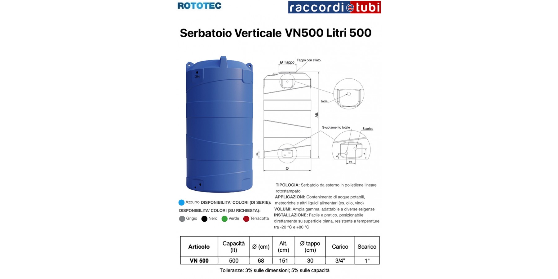 TECHNISCHES DATENBLATT AUSSENBEHÄLTER (VERTIKAL) VERTIGO Material: Außenbehälter aus monolithischem linearem Polyethylen (LLDPE), rotationsgeformt, ausgestattet mit Schraub-Inspektionsverschluss aus PP mit Entlüftung, vorgefertigten Innengewindeanschlüssen für Befüllung, Entleerung und vollständige Leerung. Funktion: Behälter zur Lagerung von Trink- und Regenwasser sowie anderen Lebensmittelflüssigkeiten. Die hohe Beständigkeit und geringe Reaktivität des linearen Polyethylens hoher Dichte ermöglicht die Verwendung der Tanks für verschiedene Flüssigkeitstypen (siehe „PE-Kompatibilitätsblatt für Flüssigkeiten“ auf www.rototec.it). Technische Eigenschaften: Die Behälter halten Temperaturschwankungen von –20 °C bis 80 °C stand, sind über die Zeit nicht abnutzbar und die verwendeten Materialien gewährleisten maximale Zuverlässigkeit in Bezug auf Korrosions- und Oxidationsprobleme. Die monolithische Struktur garantiert Robustheit und Stabilität, da keine Schweißstellen vorhanden sind, die durch innere Spannungen geschwächt werden könnten. Für Installationszwecke können Öffnungen an geeigneten Stellen im Tank gebohrt werden. Die glatten Oberflächen der Behälter ermöglichen eine einfache Wartung, das geringe Gewicht erleichtert Transport und Installation. Gebrauch und Wartung: Der Tank wird UNGEWASCHEN geliefert. Vor dem ersten Gebrauch den Innenraum mit Wasser und Reinigungsmittel oder flüssigem Geschirrspülmittel reinigen und gegebenenfalls mit HACCP-Oberflächenreiniger behandeln. Anschließend gründlich mit Wasser ausspülen. Rechtsgrundlagen: Verordnung (EG) Nr. 1935/2004 des Europäischen Parlaments und des Rates vom 27. Oktober 2004 über Materialien und Gegenstände, die mit Lebensmitteln in Berührung kommen; Verordnung (EU) Nr. 10/2011 der Kommission vom 14. Januar 2011 über Materialien und Gegenstände aus Kunststoff, die mit Lebensmitteln in Berührung kommen; Verordnung (EU) 2020/1245 der Kommission vom 02.09.2020; Ministerialerlass vom 21. März 1973 über die hygienische Vorschrift von Verpackungen, Behältern, Utensilien, die mit Lebensmitteln oder persönlichen Gebrauchsstoffen in Berührung kommen; Verordnung (EG) Nr. 2023/2006 der Kommission vom 22. Dezember 2006 über gute Herstellungspraxis bei Materialien und Gegenständen, die mit Lebensmitteln in Berührung kommen (GMP); D.P.R. Nr. 777 vom 23.08.1982 sowie spätere Änderungen und Aktualisierungen; Der Tank ist zum Lebensmittelkontakt gemäß Konformitätsbescheinigung Nr. C1070-FPM-FDC-22_1 vom 25.07.2022 ausgestellt von CSI Spa - Mailand geeignet. Farbverfügbarkeit: serienmäßig: blau; auf Anfrage: grün, schwarz, terrakotta, grau.