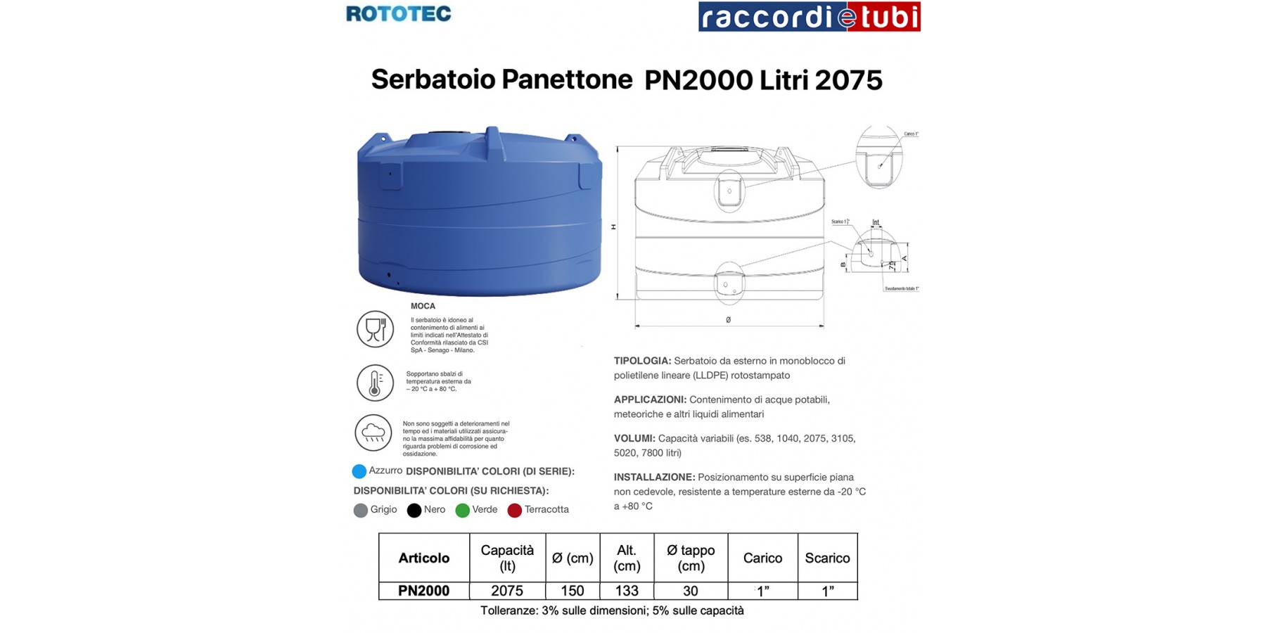TECHNISCHE DATENBLATT AUSSENTANK (PANETTONE) VERTIGO Material: Außentanks aus linearem Polyethylen (LLDPE) als Monoblock, rotationsgeformt, mit Schraubinspektionsdeckel aus PP mit Entlüftung, vorgestanzten weiblichen Gewindevorbereitungen für Befüllung, Entleerung und Komplettentleerung. Funktion: Behälter für die Lagerung von Trinkwasser, Regenwasser und anderen Lebensmittelflüssigkeiten. Die hohe Widerstandsfähigkeit und geringe Reaktivität des linearen Polyethylens mit hoher Dichte ermöglichen den Einsatz der Tanks für die Lagerung verschiedener Flüssigkeitsarten (siehe "PE-Kompatibilitätsdatenblatt für Flüssigkeiten" auf www.rototec.it). Technische Eigenschaften: Die Behälter halten Temperaturschwankungen von -20 °C bis 80 °C stand, unterliegen keiner Alterung und die verwendeten Materialien gewährleisten maximale Zuverlässigkeit hinsichtlich Korrosions- und Oxidationsproblemen. Die Monoblock-Konstruktion garantiert Robustheit und Stabilität, da keine Schweißnähte vorhanden sind, welche durch innere Spannung die belasteten Stellen schwächen könnten. Für Installationszwecke können Löcher an geeigneten Stellen im Tank angebracht werden. Die glatten Oberflächen ermöglichen eine einfache Wartung, das geringe Gewicht erleichtert Transport und Installation. Gebrauch und Pflege: Der Tank wird UNGEWÄSCHT geliefert. Vor der ersten Verwendung das Innere mit Wasser und Reinigungsmittel oder Spülmittel waschen und bei Bedarf mit einem HACCP-Flächenreiniger behandeln. Anschließend gründlich mit Wasser spülen. Rechtsvorschriften: Verordnung (EG) Nr. 1935/2004 des Europäischen Parlaments und des Rates vom 27. Oktober 2004 über Materialien und Gegenstände, die mit Lebensmitteln in Berührung kommen; Verordnung (EU) Nr. 10/2011 der Kommission vom 14. Januar 2011 über Materialien und Gegenstände aus Kunststoff, die mit Lebensmitteln in Berührung kommen; Verordnung (EU) 2020/1245 der Kommission vom 02.09.2020; Ministerialdekret vom 21. März 1973 über die hygienische Handhabung von Verpackungen, Behältern und Utensilien, die mit Lebensmitteln oder persönlichen Gebrauchsstoffen in Kontakt kommen; Verordnung (EG) Nr. 2023/2006 der Kommission vom 22. Dezember 2006 über gute Herstellungspraktiken (GMP) für Materialien und Gegenstände, die mit Lebensmitteln in Berührung kommen; Präsidentenverordnung Nr. 777 vom 23.08.1982 sowie nachfolgende Änderungen; Der Tank ist für die Lagerung von Lebensmitteln gemäß den Grenzen der Konformitätsbescheinigung Nr. C1070-FPM-FDC-22_1 vom 25.07.2022 ausgestellt von CSI Spa - Mailand geeignet. Farbverfügbarkeit: serienmäßig: blau; auf Anfrage: grün, schwarz, terrakotta, grau
