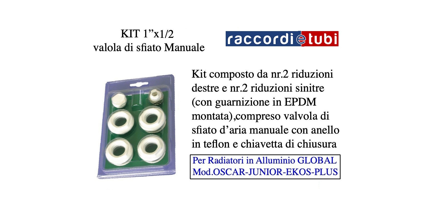 Kit bestehend aus vier Reduzierungen für ALUMINIUMRADIATOREN Flansch mm.42 1''x1/2 Ral 9010, manueller Drehentlüfter für die Modelle OSCAR, JUNIOR, EKO