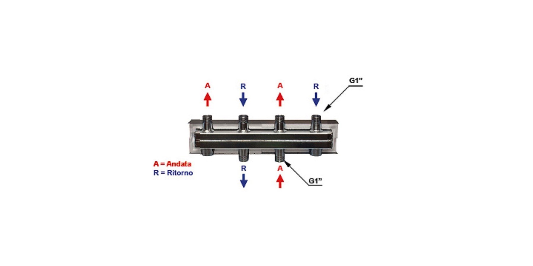 Anschluss an den hydraulischen Separator cod. HW60/125-04 mit 1" Innengewinde (Achsabstand 125 mm); für die Verbindung bitte 2 Sets cod. 04629SET (1") verwenden.