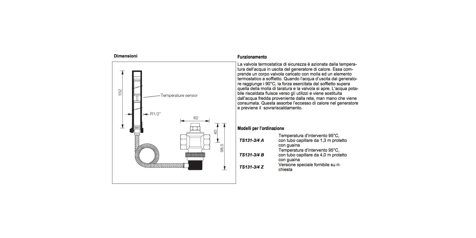 | Das Sicherheitsventil TS131 ist ein selbsttätig wirkendes Ventil, das durch die Temperatur des Wärmeerzeugerfluids aktiviert wird. Das Ventil öffnet und entlädt Wasser aus dem Wärmeerzeuger oder dem Kondensatorblock. |