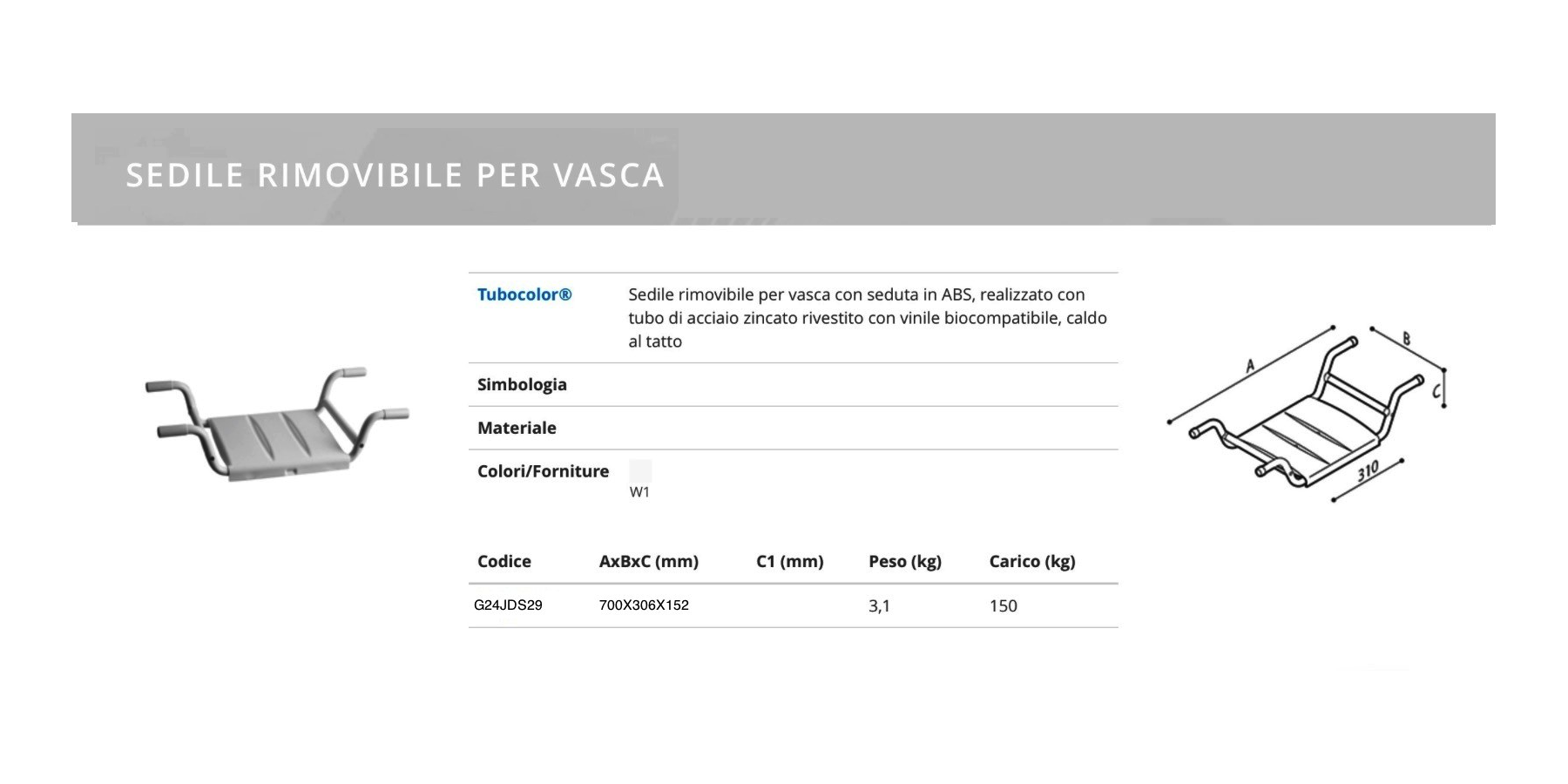 Sedile rimovibile per vasca con seduta in ABS, realizzato con tubo di acciaio zincato rivestito con vinile biocompatibile, caldo al tatto