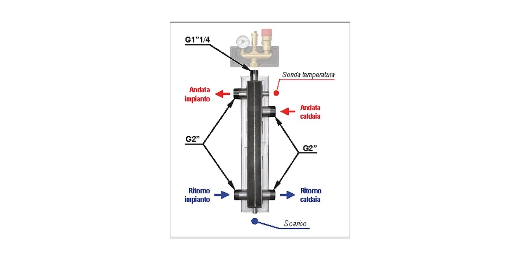 Separatore idraulico isolato per potenze fino a 165 kW, da collegare prima del collettore di distribuzione HV 80. Questo dispositivo consente di separare idraulicamente il circuito primario dal secondario e permette una maggiore circolazione volumetrica sul collettore rispetto a quanto circola in caldaia. Particolarmente consigliato in abbinamento con caldaie a condensazione. Infatti con una corretta regolazione del circolatore caldaia garantisce una temperatura di ritorno bassa (sempre inferiore a 57°C, temperatura di condensazione del vapore acqueo nel gas metano) aumentando il rendimento dell’impianto.