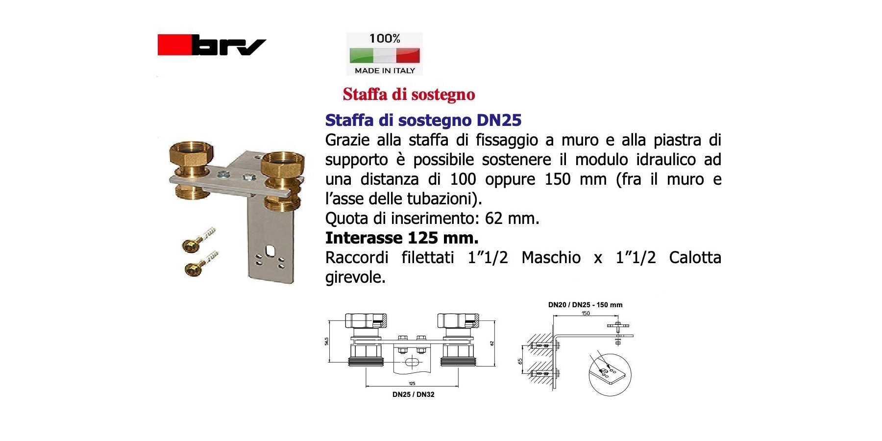 Interasse 125 mm. Raccordi filettati: 1”1/2 Maschio x 1”1/2 calotta girevole.