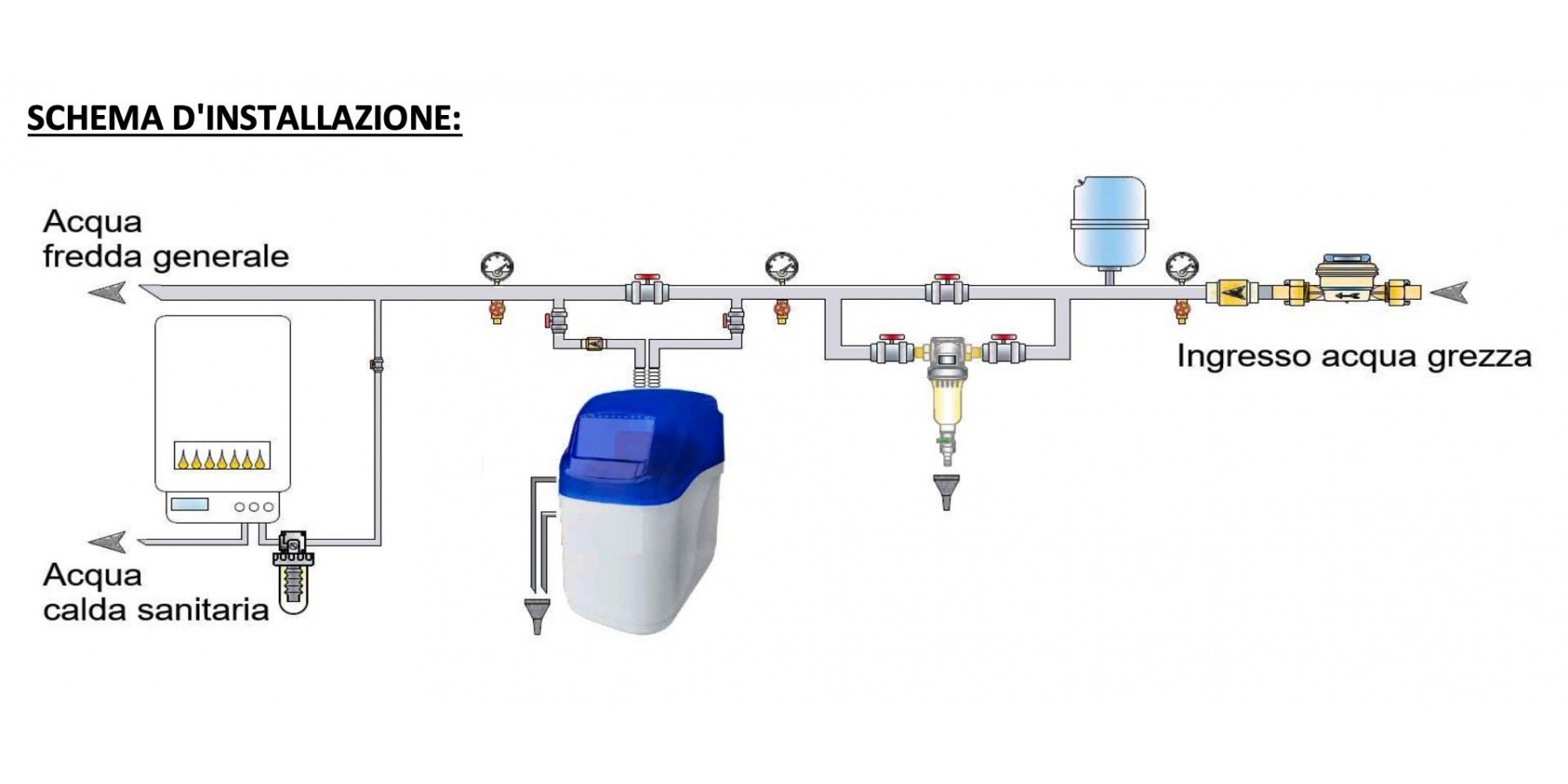 Addolcitore automatico a scambio ionico con rigenerazione volumetrica, versione cabinata salvaspazio monoblocco, uso domestico. Dotata di: