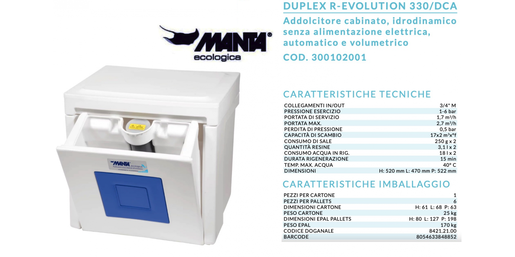 Addolcitore cabinato strutturato su due moduli di resine che lavorano in parallelo a differenza del modello DCA dove i due moduli hanno un funzionamento alternato. Questo consente una elevata portata in servizio, fino a 3000 l/h, ottimale per 3-7 appartamenti, bar, ristoranti, alberghi, applicazioni industriali. Completo di prefiltro Ydronet 5 con riduttore di pressione, valvola di non ritorno, cartuccia in rete lavabile 50 micron elicoidale autopulente.