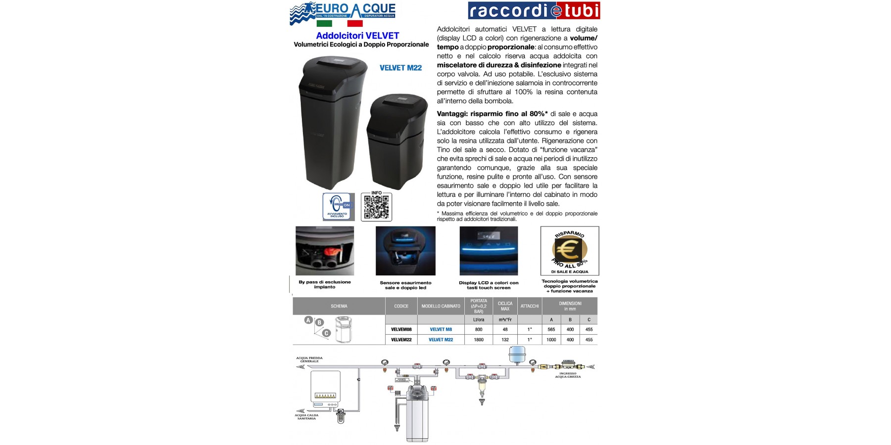 Addolcitori automatici cabinati VELVET a lettura digitale (display LCD a colori) con rigenerazione a volume/ tempo a doppio proporzionale: al consumo effettivo netto e nel calcolo riserva acqua addolcita con miscelatore di durezza & disinfezione integrati nel corpo valvola. Ad uso potabile. L’esclusivo sistema di servizio e dell’iniezione salamoia in controcorrente permette di sfruttare al 100% la resina contenuta all’interno della bombola. Vantaggi: risparmio fino al 80%* di sale e acqua sia con basso che con alto utilizzo del sistema. L’addolcitore calcola l’effettivo consumo e rigenera solo la resina utilizzata dall’utente. Rigenerazione con Tino del sale a secco. Dotato di “funzione vacanza” che evita sprechi di sale e acqua nei periodi di inutilizzo garantendo comunque, grazie alla sua speciale funzione, resine pulite e pronte all’uso. Con sensore esaurimento sale e doppio led utile per facilitare la lettura e per illuminare l’interno del cabinato in modo da poter visionare facilmente il livello sale. * Massima efficienza del volumetrico e del doppio proporzionale rispetto ad addolcitori tradizionali.