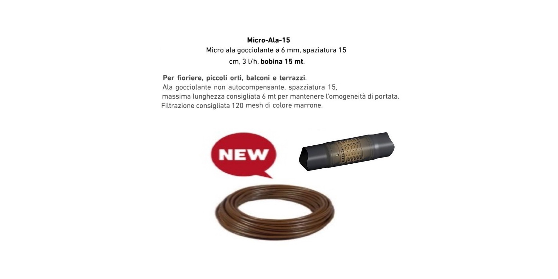 Ala gocciolante non autocompensante, spazziatura 15, massima lunghezza consigliata 6 mt per mantenere l'omogeneità di portata. Filtrazione consigliata 120 mesh di colore marrone.