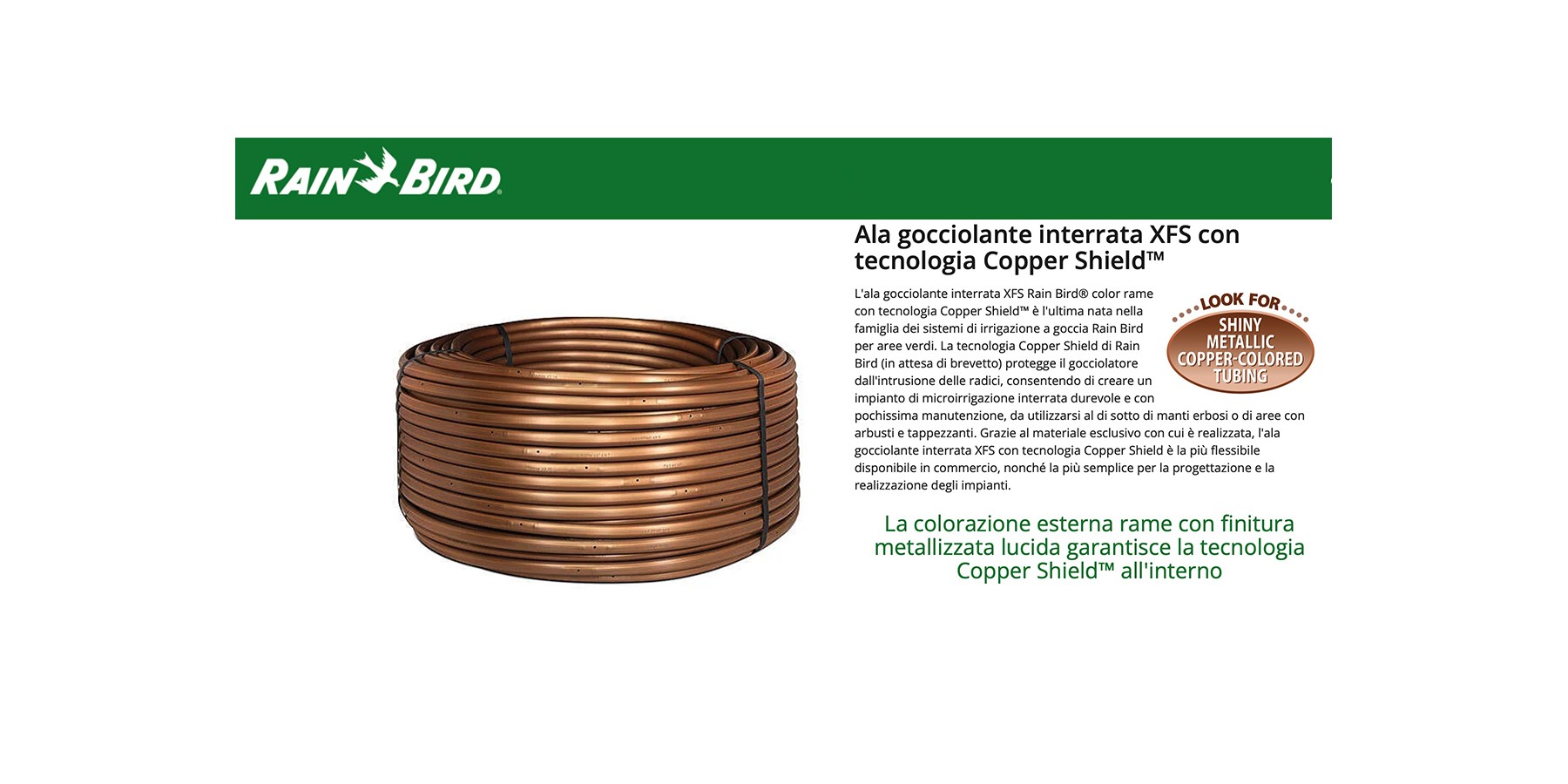 - L’ala gocciolante interrata Rain Bird® XFS con tecnologia Copper Shield™ è l’ultima nata nella famiglia dei prodotti per microirrigazione Rain Bird. La tecnologia brevettata Rain Bird Copper Shield protegge il gocciolatore dall’intrusione delle radici, consentendo di creare un sistema di irrigazione a goccia durevole e con ridottissima manutenzione da utilizzarsi al di sotto dei tappeti erbosi o di aree con arbusti e tappezzanti.