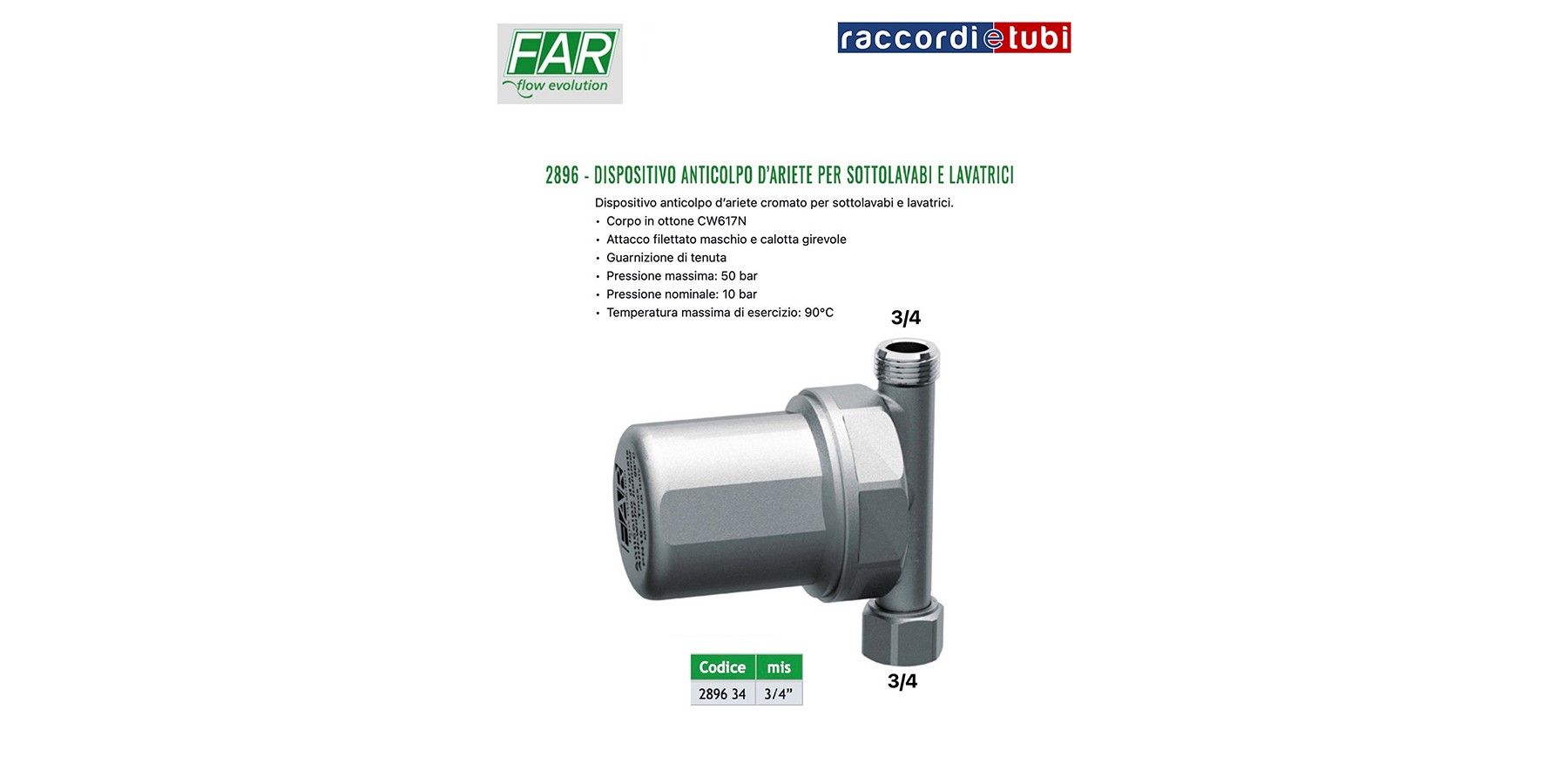 Dispositivo anticolpo d’ariete cromato per sottolavabi e lavatrici. • Corpo in ottone CW617N • Attacco flettato maschio e calotta girevole • Guarnizione di tenuta • Pressione massima: 50 bar • Pressione nominale: 10 bar • Temperatura massima di esercizio: 90°C