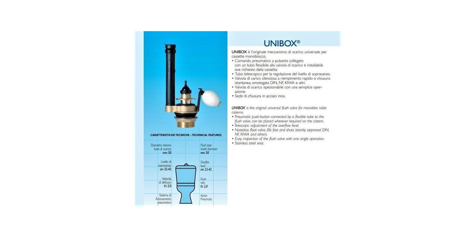 UNIBOX è l'originale meccanismo di scarico universale per cassette monoblocco. • Comando pneumatico a pulsante collegato con un tubo flessibile alla valvola di scarico e installabile ove richiesto dalla cassetta • Tubo telescopico per la regolazione del livello di sopravanzo. • Valvola di carico silenziosa a riempimento rapido e chiusura istantanea, omologata DIN, NF, KIWA e altri. • Valvola di scarico ispezionabile con una semplice operazione. • Sede di chiusura in acciaio inox