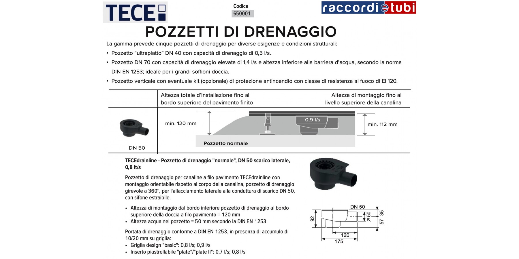 TECEdrainline - Pozzetto di drenaggio "piatto", DN 50 scarico laterale,