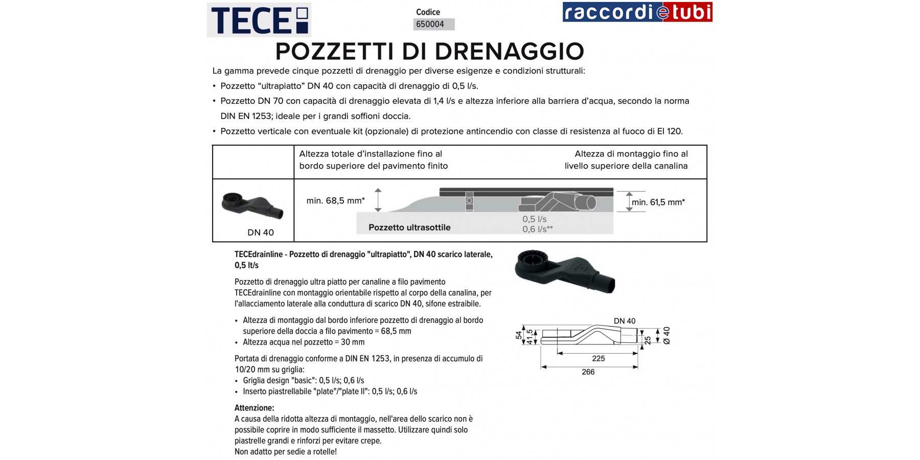 TECEdrainline - Pozzetto di drenaggio "normale", DN 50 scarico laterale,