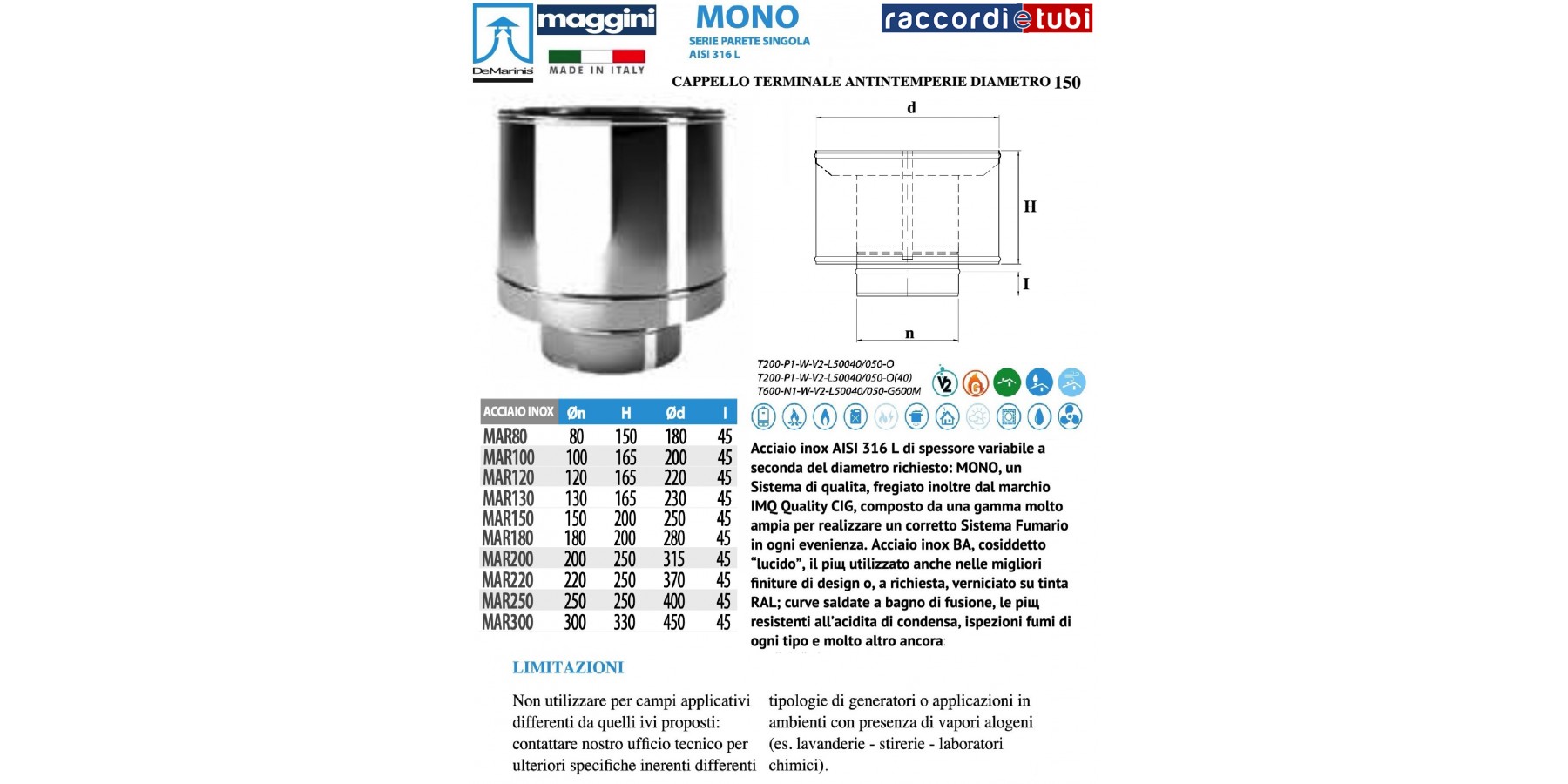 Acciaio inox AISI 316 L di spessore variabile a seconda del diametro richiesto: MONO, un Sistema di qualità, fregiato inoltre dal marchio IMQ Quality CIG, composto da una gamma molto ampia per realizzare un corretto Sistema Fumario in ogni evenienza. Acciaio inox BA, cosiddetto “lucido”, il più utilizzato anche nelle migliori finiture di design o, a richiesta, verniciato su tinta RAL; curve saldate a bagno di fusione, le più resistenti all’acidità di condensa, ispezioni fumi di ogni tipo e molto altro ancora: chiedi ai nostri uffici maggiori informazioni.