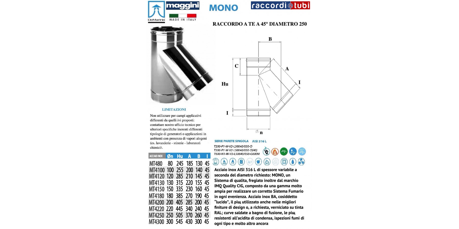 Acciaio inox AISI 316 L di spessore variabile a seconda del diametro richiesto: MONO, un Sistema di qualità, fregiato inoltre dal marchio IMQ Quality CIG, composto da una gamma molto ampia per realizzare un corretto Sistema Fumario in ogni evenienza. Acciaio inox BA, cosiddetto “lucido”, il più utilizzato anche nelle migliori finiture di design o, a richiesta, verniciato su tinta RAL; curve saldate a bagno di fusione, le più resistenti all’acidità di condensa, ispezioni fumi di ogni tipo e molto altro ancora: chiedi ai nostri uffici maggiori informazioni.