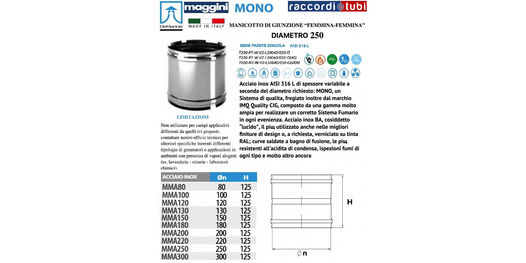 Acciaio inox AISI 316 L di spessore variabile a seconda del diametro richiesto: MONO, un Sistema di qualità, fregiato inoltre dal marchio IMQ Quality CIG, composto da una gamma molto ampia per realizzare un corretto Sistema Fumario in ogni evenienza. Acciaio inox BA, cosiddetto “lucido”, il più utilizzato anche nelle migliori finiture di design o, a richiesta, verniciato su tinta RAL; curve saldate a bagno di fusione, le più resistenti all’acidità di condensa, ispezioni fumi di ogni tipo e molto altro ancora: chiedi ai nostri uffici maggiori informazioni.