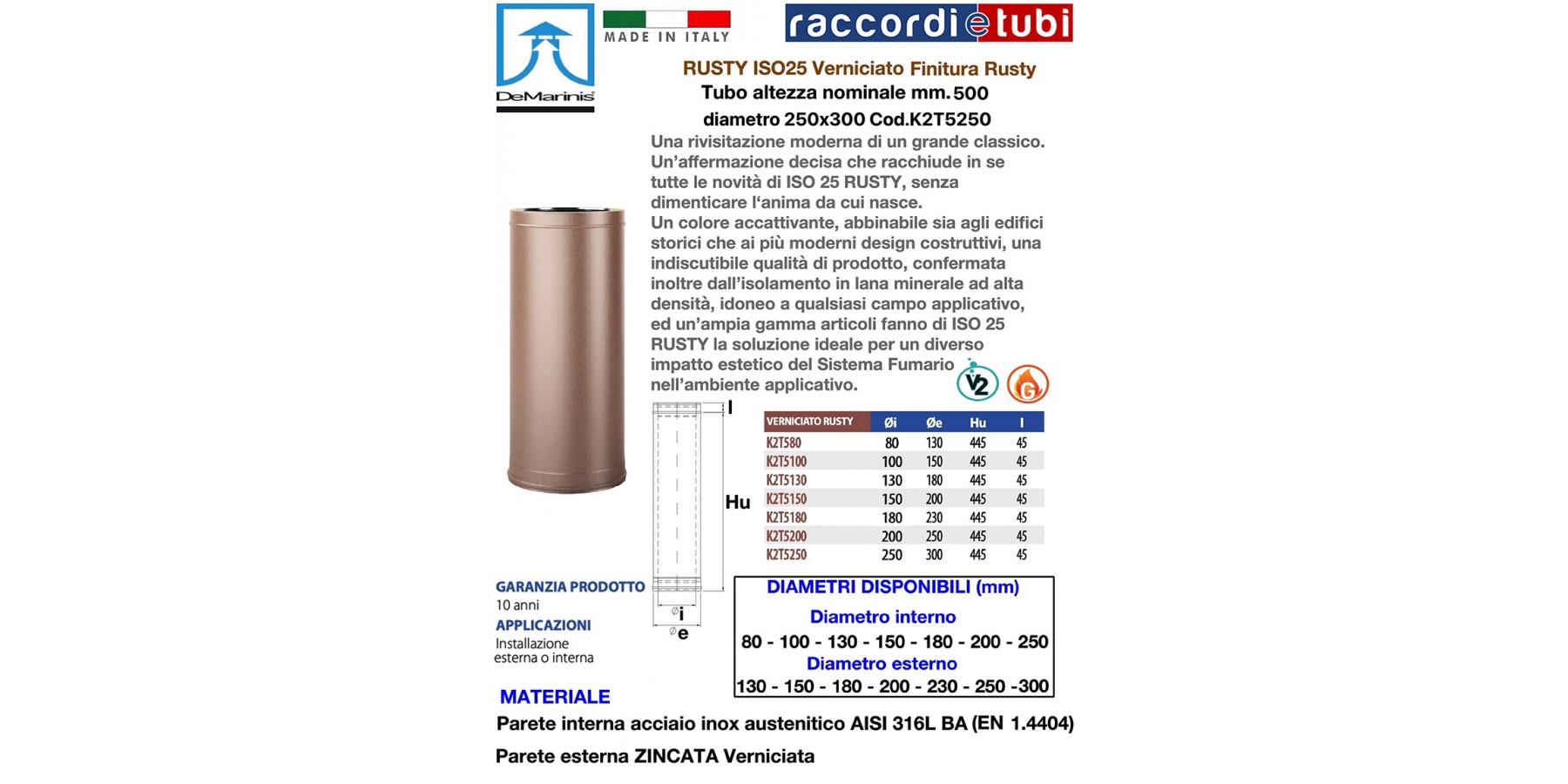 Elementi componibili rigidi doppia parete Sistema ISO 25 RUSTY con qualità e finiture della parete esterna verniciato “Rusty” per De Marinis S.r.l., realizzati con parete interna in acciaio inox AISI 316 L di spessore minimo 0,4 mm e parete esterna in lamiera zincata di spessore 0,5 mm, rispondenti agli standard previsti dalla marcatura europea CE secondo normativa EN 1856-1 2009, aventi requisiti di designazione T200-P1-W-V2-L50040-O40 per applicazioni con guarnizione, in alternativa, per applicazioni senza guarnizione di tenuta, aventi designazione T600-N1-W-V2-L50040-G85 secondo i medesimi standard sopra descritti. Coibentazione realizzata in lana minerale ad alta densità di spessore 25 mm, pressata ed interposta tra le pareti senza elementi di giunzione tra le stesse (ponte termico).