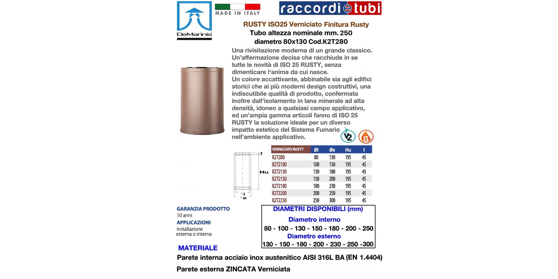Elementi componibili rigidi doppia parete Sistema ISO 25 RUSTY con qualità e finiture della parete esterna verniciato “Rusty” per De Marinis S.r.l., realizzati con parete interna in acciaio inox AISI 316 L di spessore minimo 0,4 mm e parete esterna in lamiera zincata di spessore 0,5 mm, rispondenti agli standard previsti dalla marcatura europea CE secondo normativa EN 1856-1 2009, aventi requisiti di designazione T200-P1-W-V2-L50040-O40 per applicazioni con guarnizione, in alternativa, per applicazioni senza guarnizione di tenuta, aventi designazione T600-N1-W-V2-L50040-G85 secondo i medesimi standard sopra descritti. Coibentazione realizzata in lana minerale ad alta densità di spessore 25 mm, pressata ed interposta tra le pareti senza elementi di giunzione tra le stesse (ponte termico).