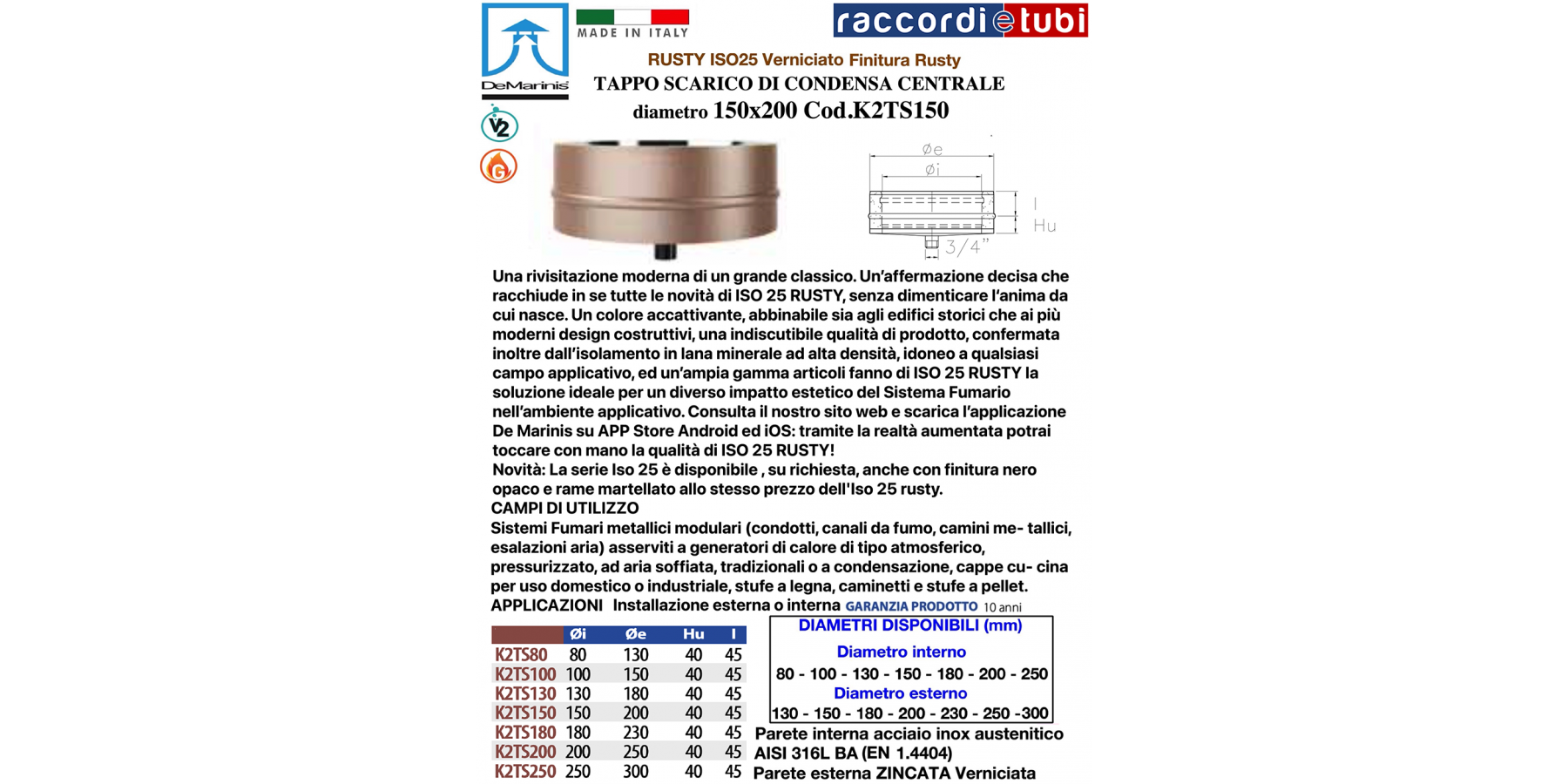 Elementi componibili rigidi doppia parete Sistema ISO 25 RUSTY con qualità e finiture della parete esterna verniciato “Rusty” per De Marinis S.r.l., realizzati con parete interna in acciaio inox AISI 316 L di spessore minimo 0,4 mm e parete esterna in lamiera zincata di spessore 0,5 mm, rispondenti agli standard previsti dalla marcatura europea CE secondo normativa EN 1856-1 2009, aventi requisiti di designazione T200-P1-W-V2-L50040-O40 per applicazioni con guarnizione, in alternativa, per applicazioni senza guarnizione di tenuta, aventi designazione T600-N1-W-V2-L50040-G85 secondo i medesimi standard sopra descritti. Coibentazione realizzata in lana minerale ad alta densità di spessore 25 mm, pressata ed interposta tra le pareti senza elementi di giunzione tra le stesse (ponte termico).