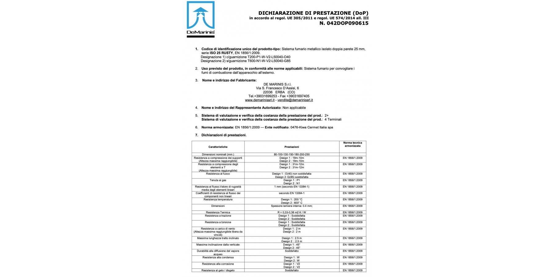 Elementi componibili rigidi doppia parete Sistema ISO 25 RUSTY con qualità e finiture della parete esterna verniciato “Rusty” per De Marinis S.r.l., realizzati con parete interna in acciaio inox AISI 316 L di spessore minimo 0,4 mm e parete esterna in lamiera zincata di spessore 0,5 mm, rispondenti agli standard previsti dalla marcatura europea CE secondo normativa EN 1856-1 2009, aventi requisiti di designazione T200-P1-W-V2-L50040-O40 per applicazioni con guarnizione, in alternativa, per applicazioni senza guarnizione di tenuta, aventi designazione T600-N1-W-V2-L50040-G85 secondo i medesimi standard sopra descritti. Coibentazione realizzata in lana minerale ad alta densità di spessore 25 mm, pressata ed interposta tra le pareti senza elementi di giunzione tra le stesse (ponte termico).