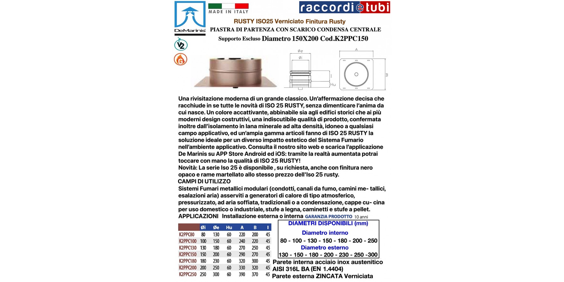 Elementi componibili rigidi doppia parete Sistema ISO 25 RUSTY con qualità e finiture della parete esterna verniciato “Rusty” per De Marinis S.r.l., realizzati con parete interna in acciaio inox AISI 316 L di spessore minimo 0,4 mm e parete esterna in lamiera zincata di spessore 0,5 mm, rispondenti agli standard previsti dalla marcatura europea CE secondo normativa EN 1856-1 2009, aventi requisiti di designazione T200-P1-W-V2-L50040-O40 per applicazioni con guarnizione, in alternativa, per applicazioni senza guarnizione di tenuta, aventi designazione T600-N1-W-V2-L50040-G85 secondo i medesimi standard sopra descritti. Coibentazione realizzata in lana minerale ad alta densità di spessore 25 mm, pressata ed interposta tra le pareti senza elementi di giunzione tra le stesse (ponte termico).
