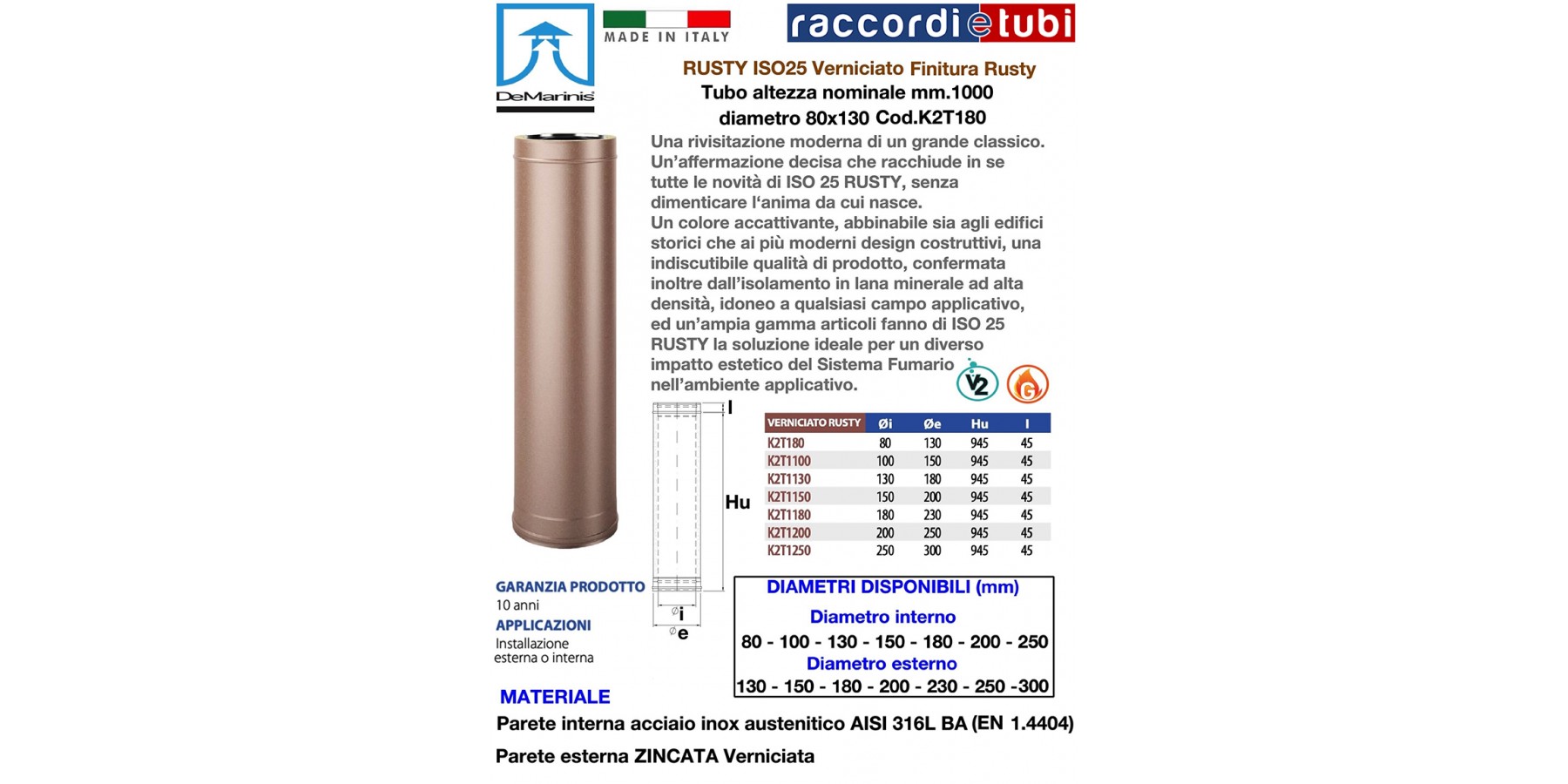 Elementi componibili rigidi doppia parete Sistema ISO 25 RUSTY con qualità e finiture della parete esterna verniciato “Rusty” per De Marinis S.r.l., realizzati con parete interna in acciaio inox AISI 316 L di spessore minimo 0,4 mm e parete esterna in lamiera zincata di spessore 0,5 mm, rispondenti agli standard previsti dalla marcatura europea CE secondo normativa EN 1856-1 2009, aventi requisiti di designazione T200-P1-W-V2-L50040-O40 per applicazioni con guarnizione, in alternativa, per applicazioni senza guarnizione di tenuta, aventi designazione T600-N1-W-V2-L50040-G85 secondo i medesimi standard sopra descritti. Coibentazione realizzata in lana minerale ad alta densità di spessore 25 mm, pressata ed interposta tra le pareti senza elementi di giunzione tra le stesse (ponte termico).