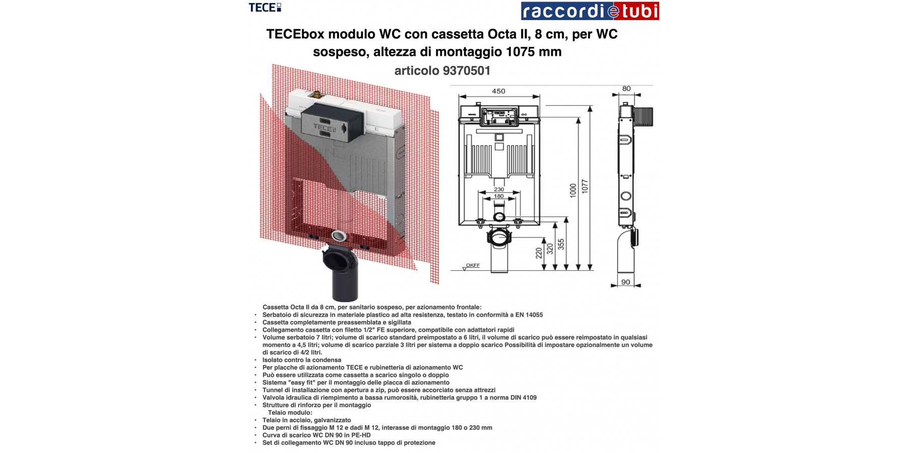 TECE Octa II ha una profondità di soli 8 cm e una larghezza ridotta (solo 50 cm nella versione cartongesso). Ideale: in termini di modularità - come elemento della gamma TECEprofil, per la costruzione di pareti a secco; in termini di efficienza - grazie a nuovi componenti che rendono il montaggio ancora più rapido e semplice; in termini di design - con la possibilità di installare l’intera gamma di placche di comando TECE.Perfetta per ogni tipo di installazione: nonostante la profondità d’installazione di soli 8 cm, la cassetta TECE Octa II non scende a compromessi per la migliore esperienza di scarico.