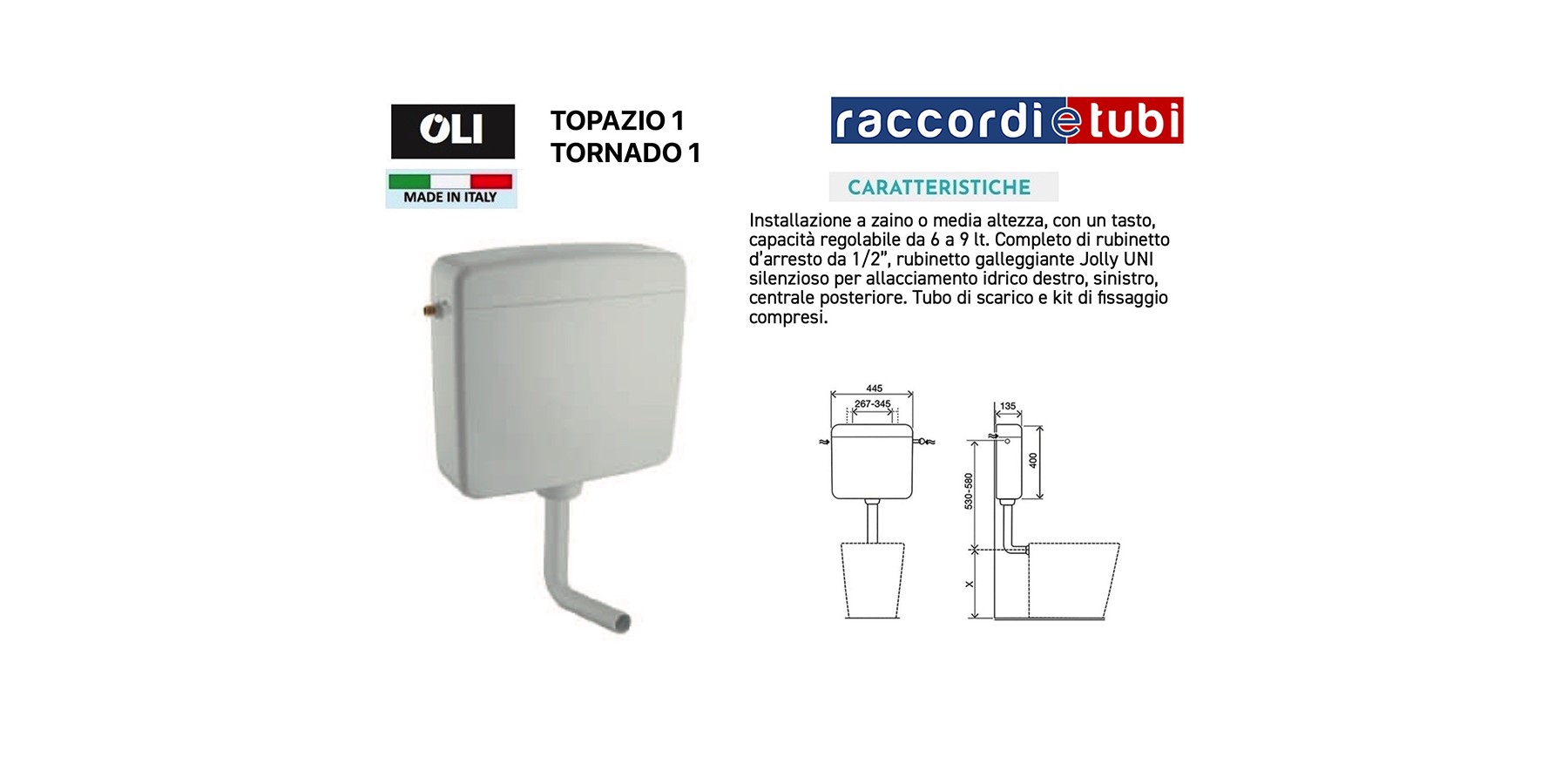 Installazione a zaino o media altezza, con un tasto, capacità regolabile da 6 a 9 lt. Completo di rubinetto d’arresto da 1/2”, rubinetto galleggiante Jolly UNI silenzioso per allacciamento idrico destro, sinistro, centrale posteriore. Tubo di scarico e kit di fissaggio compresi.