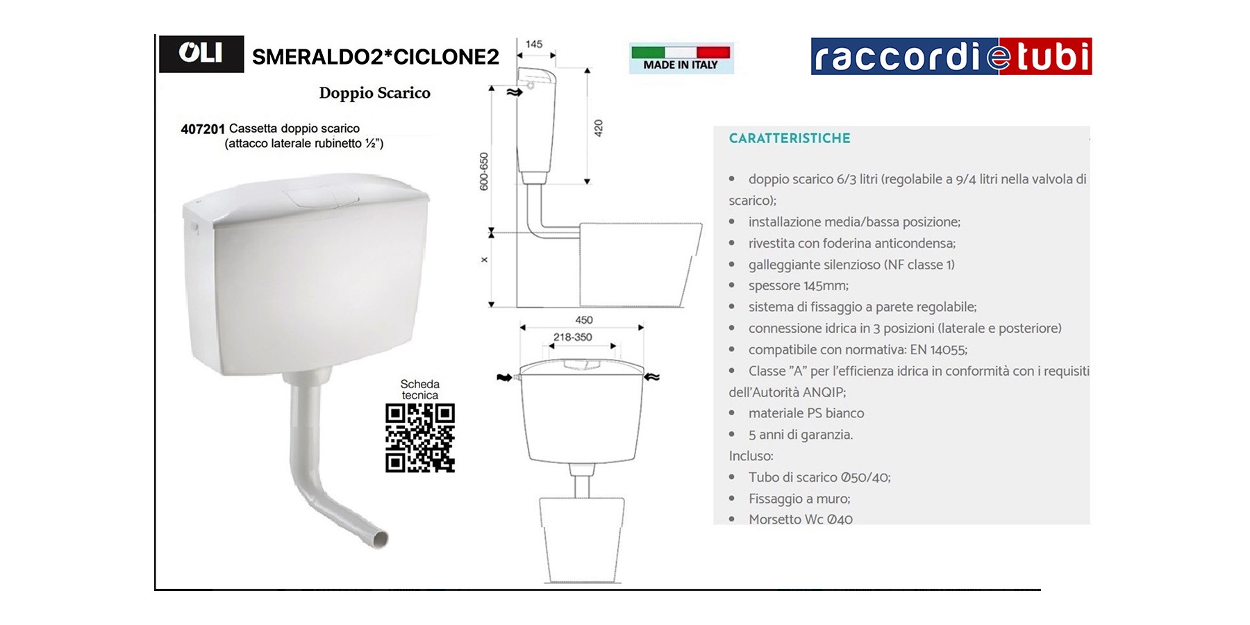 Doppio scarico 6/3 litri (regolabile a 9/4 litri). - Medio, bassa installazione. - Rivestimento acustico interno e anti-condensa. - Galleggiante silenzioso (Classe I NF). - Spessore 145 mm. - Sistema di fissaggio regolabile. - Connessioni rete idrica - 3 posizioni*. - Certificato secondo CE EN 14055 CL. - Classe “A” di efficienza idrica in conformità con i requisiti ANQIP. - Materiale PS bianco. - Garanzia 5 anni. Incluso - Tubo di scarico Ø 50/40. - Accessori di fissaggio. - Morsetto WC.