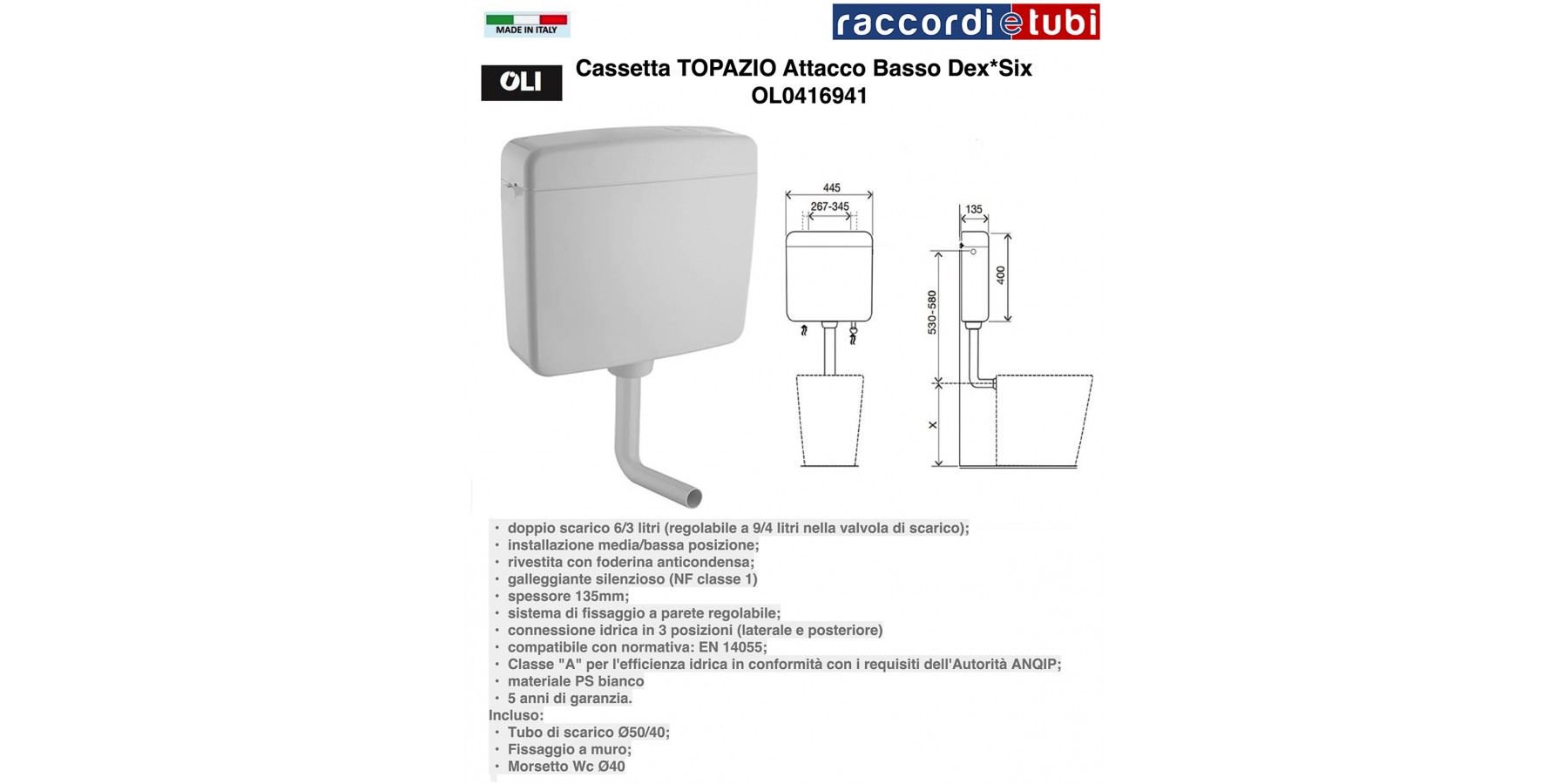 - Le cassette di scarico OLI sono realizzate in materiale termoplastico brillante con elevata resistenza agli urti e ai graffi. Alcuni modelli sono accessibili in una vasta gamma di colori, oltre al tradizionale bianco brillante. Topazio è una cassetta esterna a medio-bassa posizione, in altre parole si applica direttamente sulla parete leggermente sopra il sanitario.
