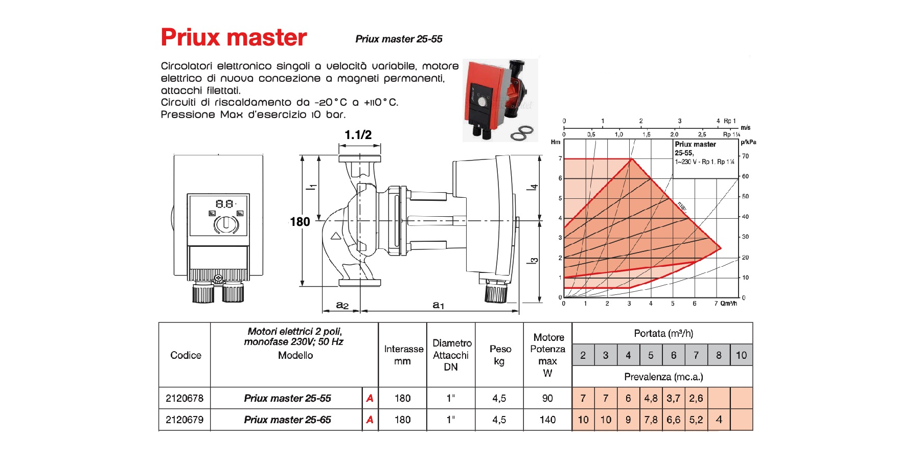 Circolatori elettronico singoli a velocità variabile, motore elettrico di nuova concezione a magneti permanenti, attacchi FILETTATI Circuiti di riscaldamento da -20°C a 110°C. Pressione Max d’esercizio 10 bar.