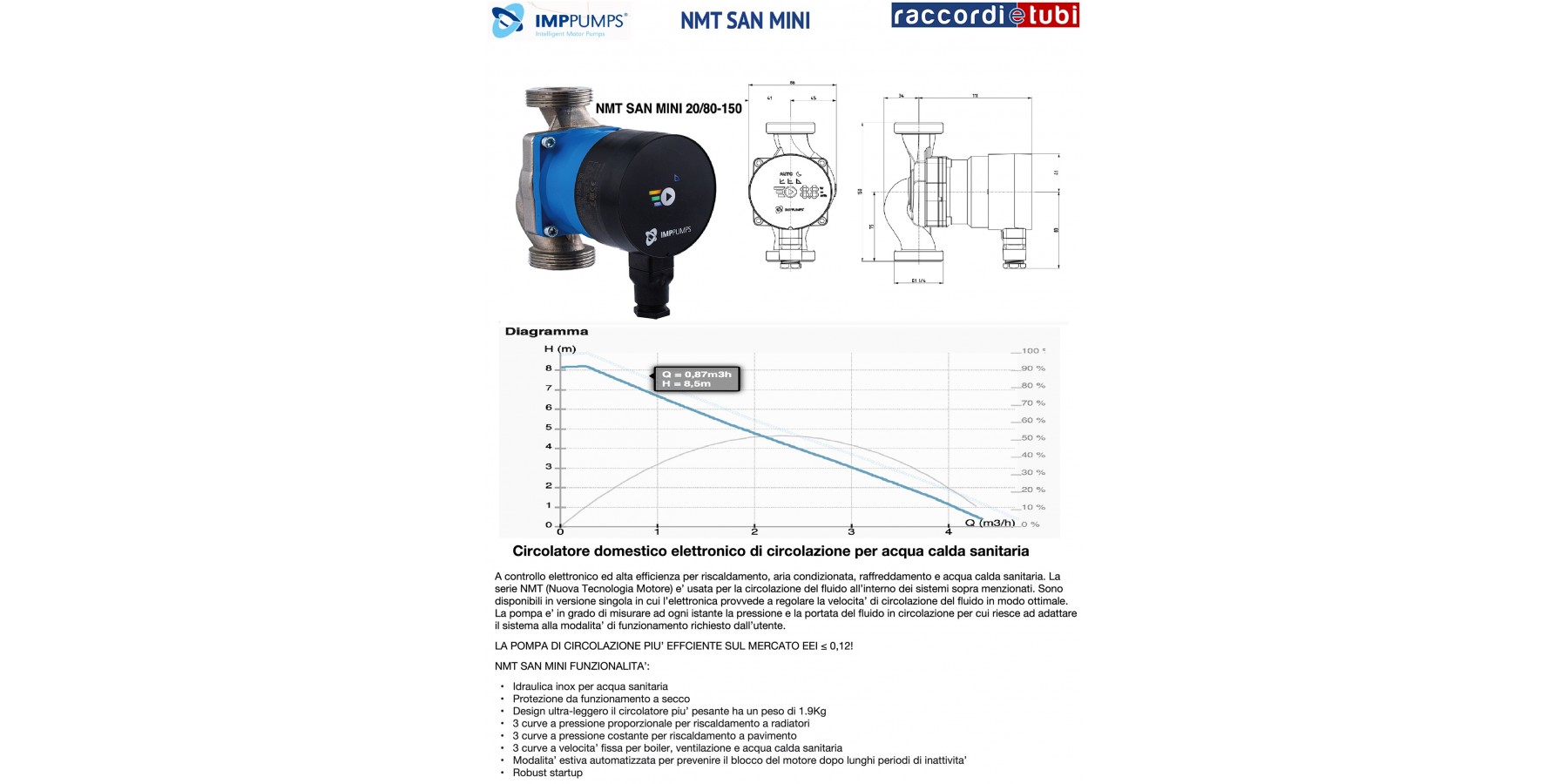 A controllo elettronico ed alta efficienza per riscaldamento, aria condizionata, raffreddamento e acqua calda sanitaria. La serie NMT (Nuova Tecnologia Motore) e’ usata per la circolazione del fluido all’interno dei sistemi sopra menzionati. Sono disponibili in versione singola in cui l’elettronica provvede a regolare la velocita’ di circolazione del fluido in modo ottimale. La pompa e’ in grado di misurare ad ogni istante la pressione e la portata del fluido in circolazione per cui riesce ad adattare il sistema alla modalita’ di funzionamento richiesto dall’utente.