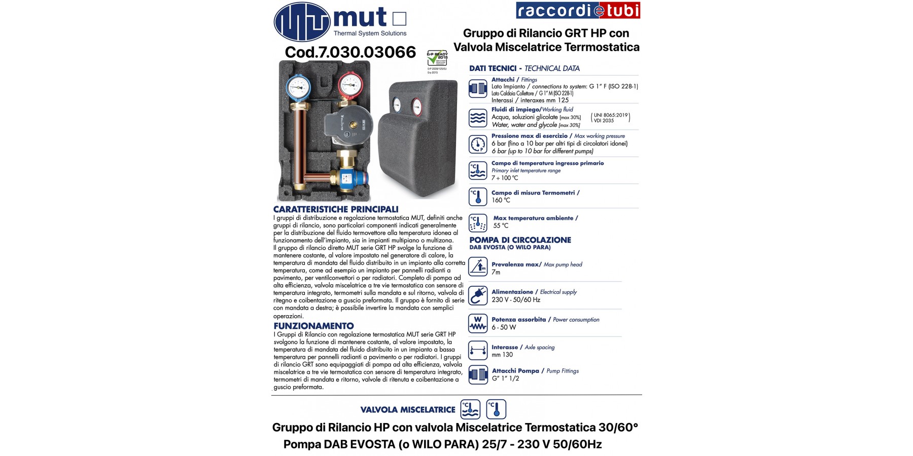 Gruppo di Rilancio HP con valvola Miscelatrice Termostatica 30/60° Pompa DAB EVOSTA (o WILO PARA) 25/7 - 230 V 50/60Hz